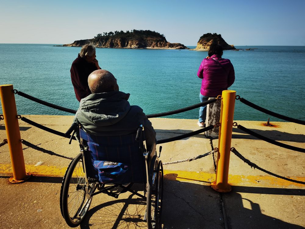 这位老人坐着轮椅来观光