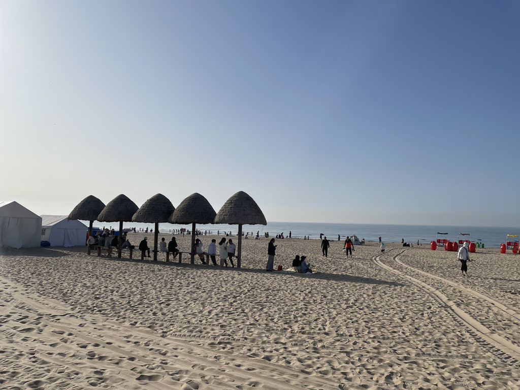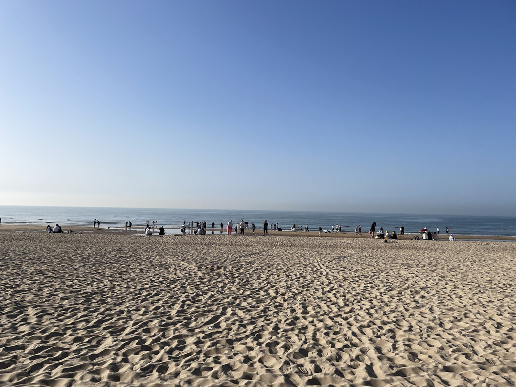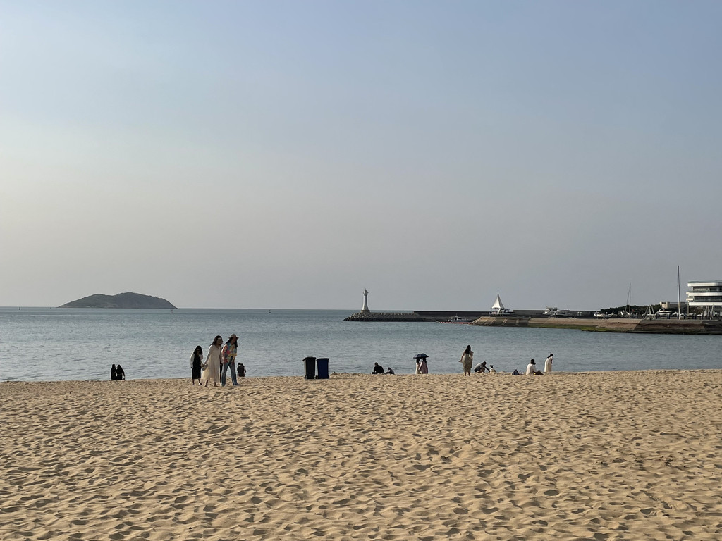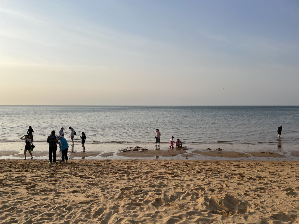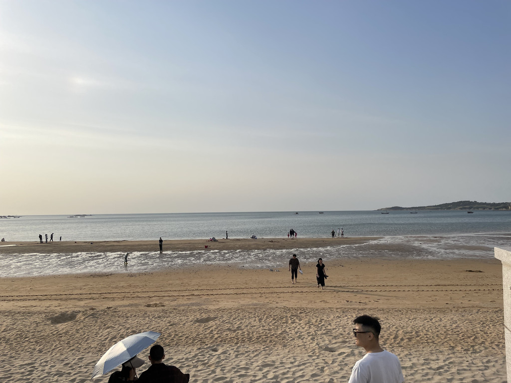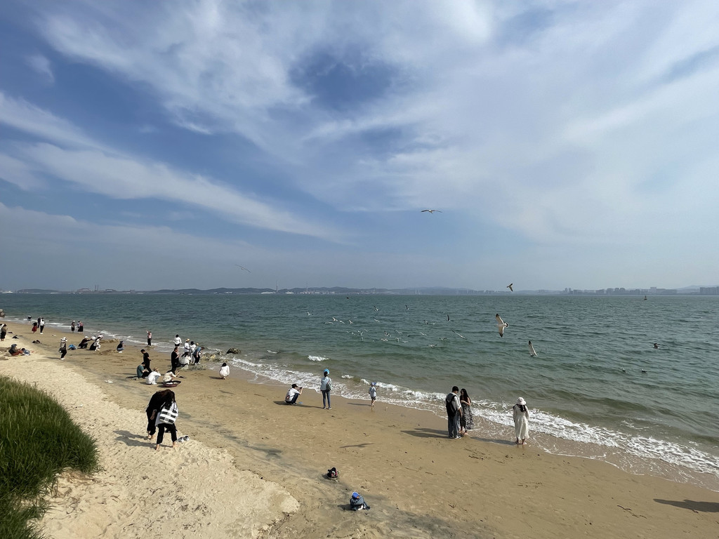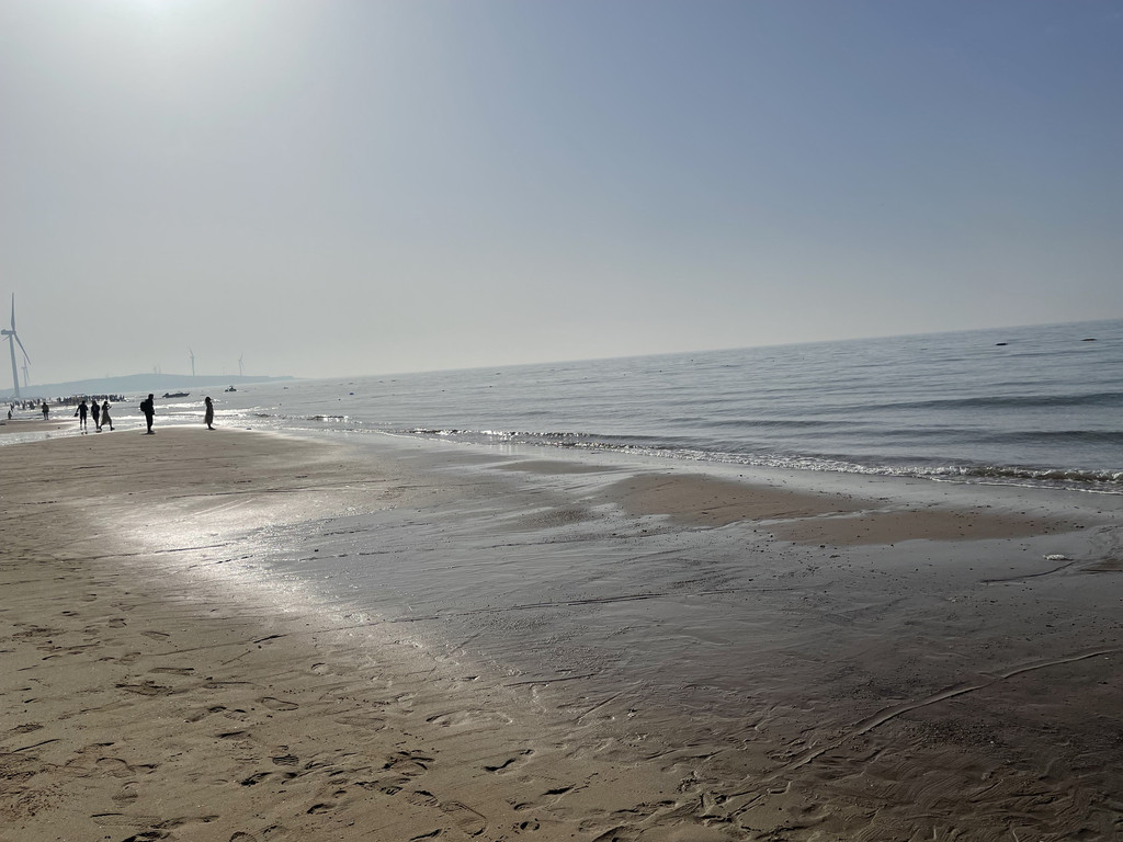 到了那香海,把车停到路边的停车场。这是个海水浴场,有很大的沙滩,沙子很细,海水很清,沙滩上有很多海浪冲上来的鹅卵石,不少人在低头捡拾,再加上马路边那一排排的大风车,非常的出片。气温不高,仍有几个人在游泳。虽是工作日,人气也不错。游玩了大约50分钟,出发返回威海市区。