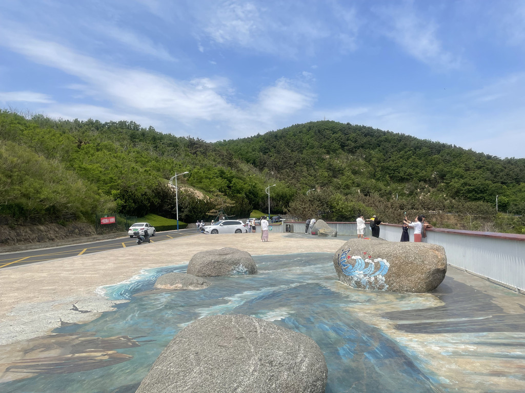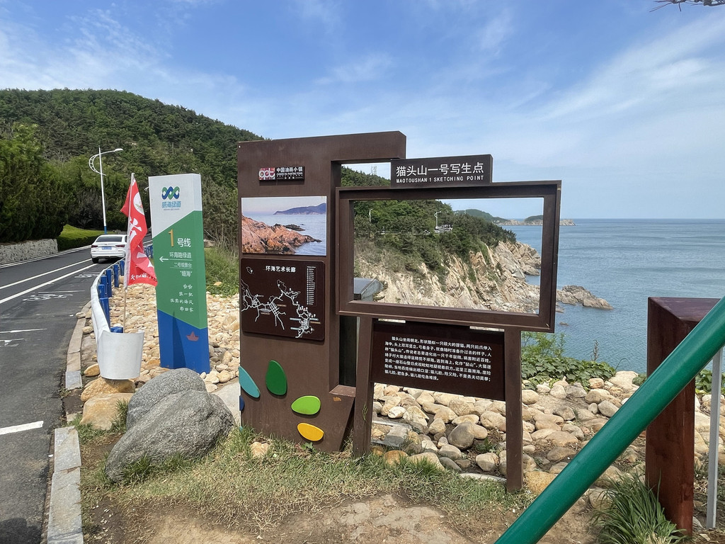 顺着环海路绿道继续前行,不远就是二号观景平台-嬉海,这也是“中国油画小镇猫头山一号写生点“,也是网红打卡地,在这里可以看到猫头山的全貌和雄姿。
