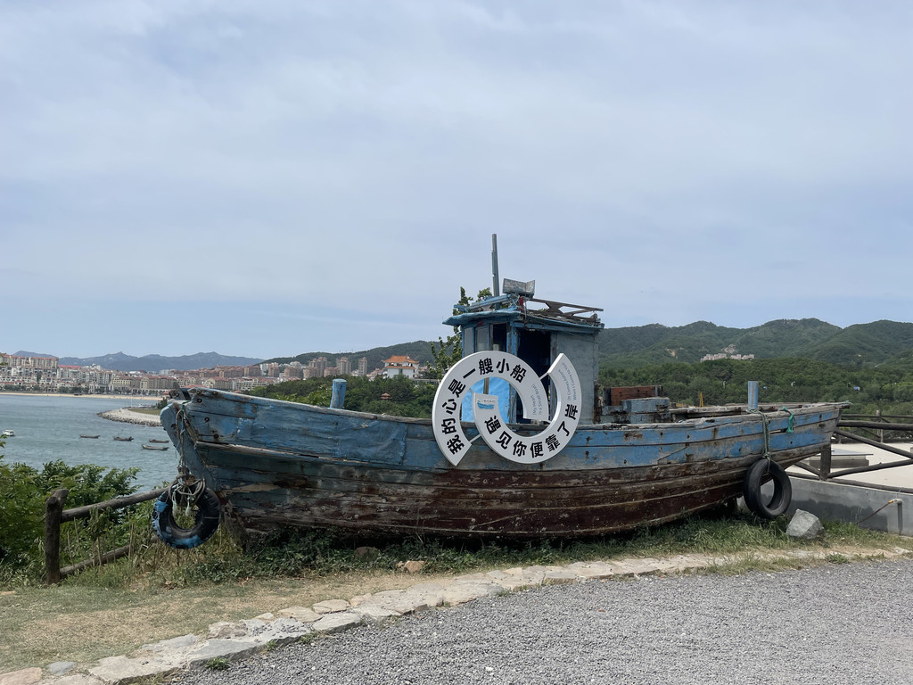 由于江古咀挨着猫头山景区,据说风景不错,早饭后决定先去江古咀。退完房,导航选择江古咀,到了一个停车场,旁边有个栏杆挡着,无法再前行,把车停下,向海边走去,有个路牌标着“梭鱼台”观景平台。路边停放着好几艘退役的小船,船上装饰着一两条文艺的标语,甚是可爱,很有威海范。沿路走去,景色优美,港湾里停泊着好多小船,伸向海中的岩石陡立,非常出片。