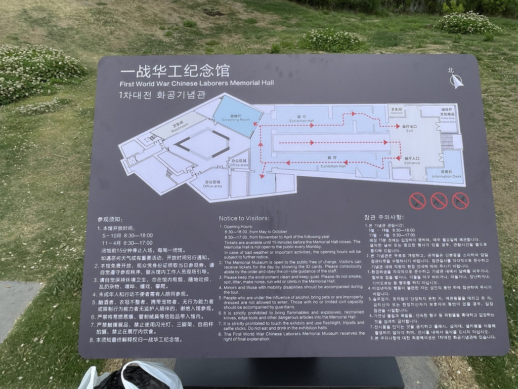 到了海源公园,停好车,向海边走去,公园旁边就是合庆码头,码头上停靠着很多渔船,场面很壮观,非常出片。拍了几张照片,决定去参观一下设在公园旁边的“一战华工纪念馆”,导航建议从公园旁边的马路(环岛路和连林岛路)走过去,虽然也不远,但是参观完从出口出来才知道公园里有一条近道,可惜导航搜不到。“一战华工”是个并不很知名的群体,我也是到威海才第一次听说和了解,深为震撼。纪念馆参观用时约1小时。