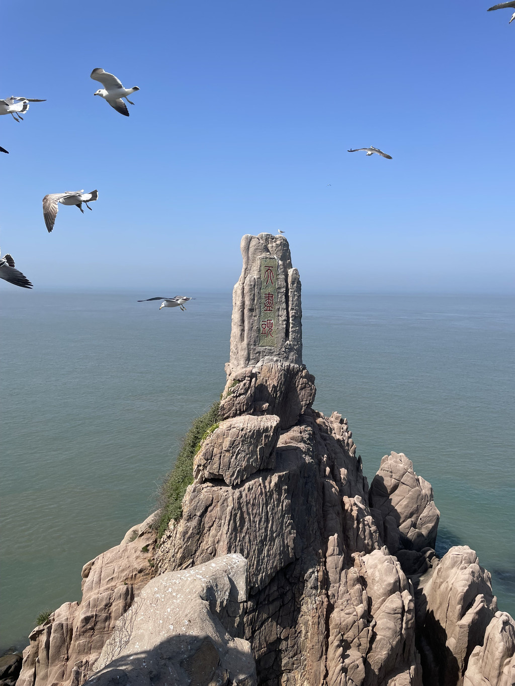 开到成山头航海展览馆,于是停车决定参观一下,参观完展览馆,从出口走出后才发现展览馆的东侧就是天尽头,得来全不费工夫啊。走过网红打卡地-海角邮局,就看到了那像定海神针一样耸立在海中间的“天尽头”石柱。成群的海鸥绕着天尽头飞翔,由于在附近的平台上有游客在喂食,海鸥飞得很低,甚是壮观。