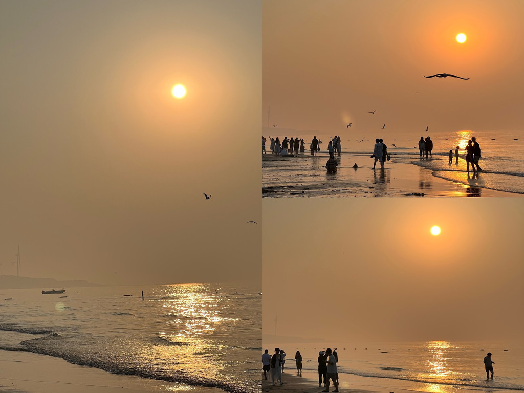伴随着早上5点的闹钟,我第一个挣扎着睁开眼,赶紧把孩子从床上薅起来,快点快点,晚了就看不到日出了。迷迷蒙蒙中我们赶到海边,还好太阳也刚刚睡醒,正揉着惺忪的眼睛,准备从浪花床上慵懒起身。五点半的海岸线还裹着薄雾,沙滩像被海水漂白的亚麻布,细密地铺展到天边。