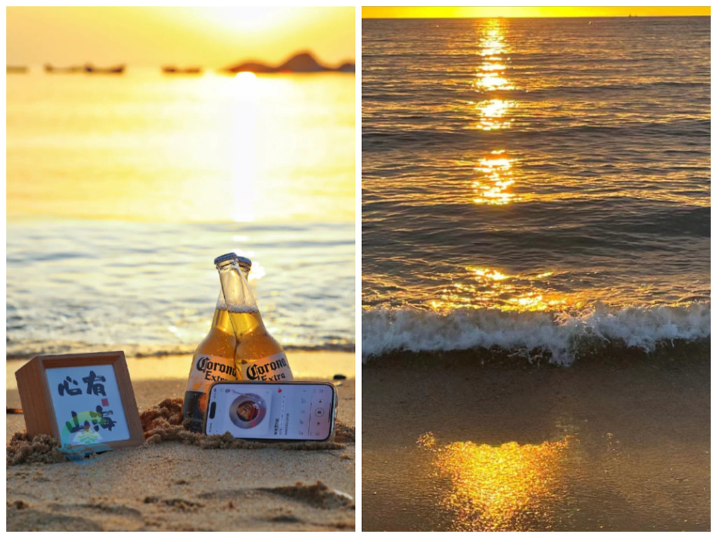 日落时分,整片海变成橘子果酱。整片海岸化作碎钻铺就的绸缎,连呼吸都染上橙色的甜。