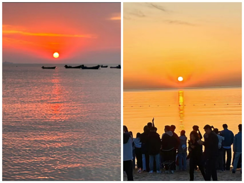 半月湾是“C”型海湾,形如新月的海岸线上环聚着观日出的人们。大家默契地保持着某种仪式般的静默。当第一道金光突然刺破云层时,整个海湾的剪影骤然镀上金边,潮声里传来此起彼伏的快门声,浪花在暗处发出细碎的欢呼。