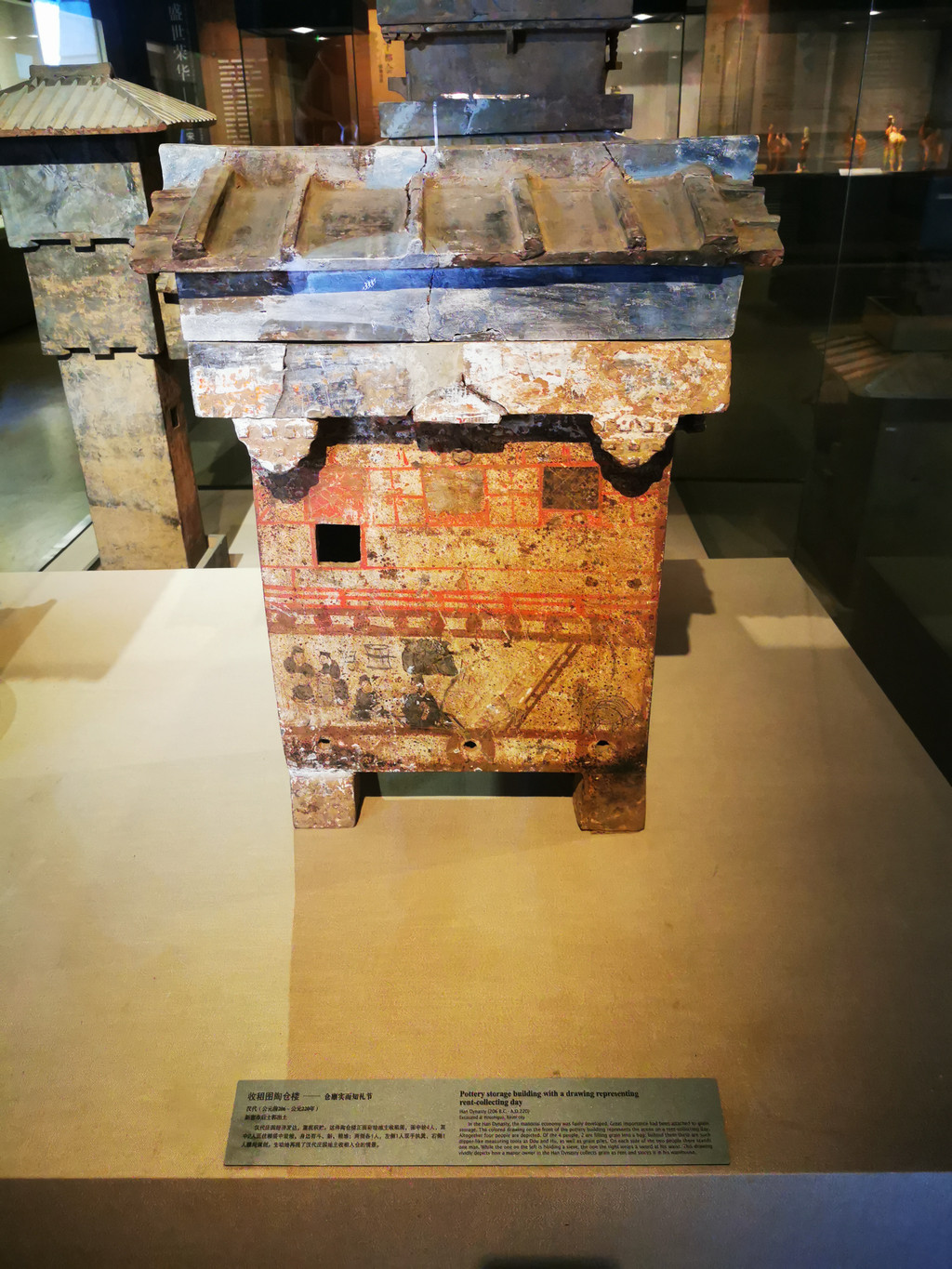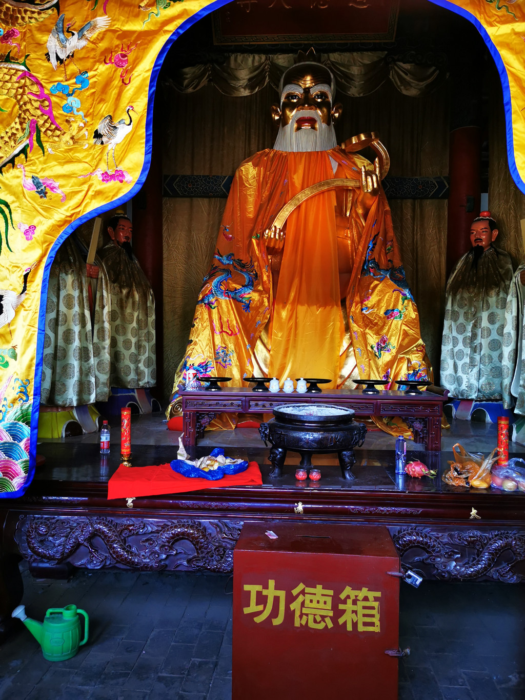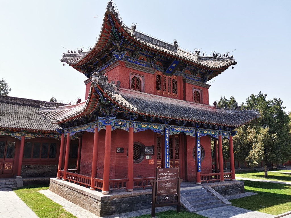 坐北朝南,下部为高约七米的台基,上部为重檐歇山式的琉璃瓦房顶。