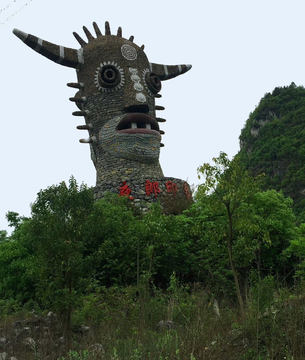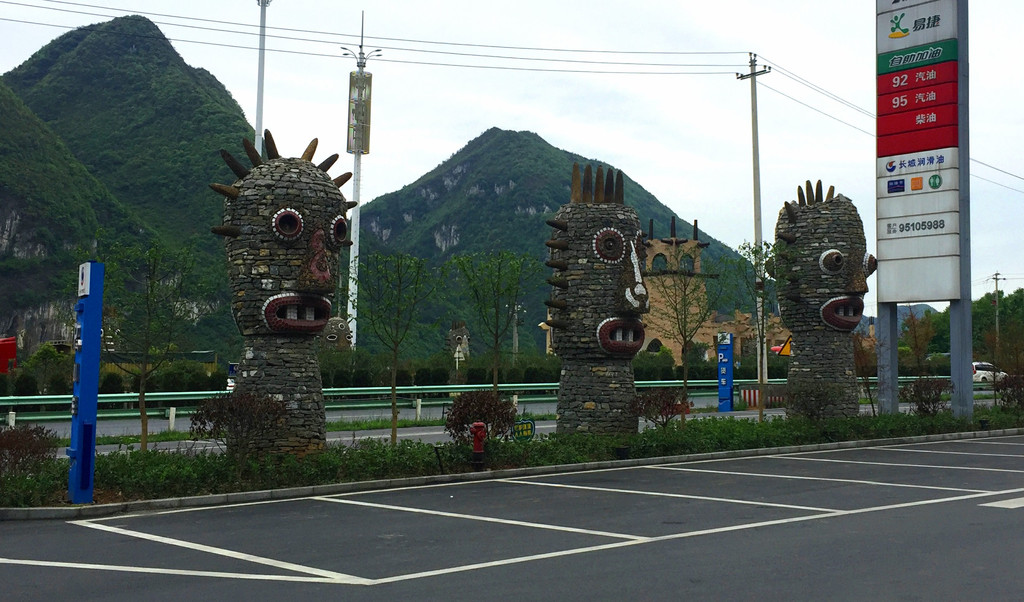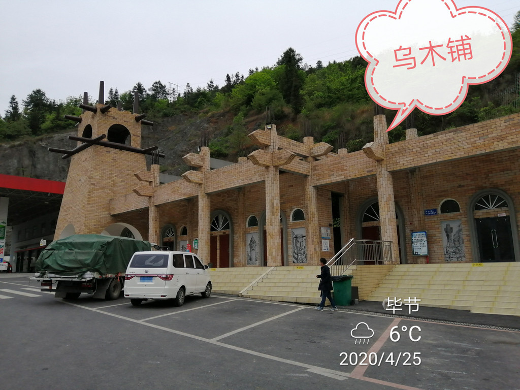 毕威高速在宏大地乌蒙群山中穿行。赫章县境内,有一个名叫“乌木铺”的停车区,远远看到停车区里耸立着三座图腾,都是用碎石堆砌的雕塑。停车区里的建筑貌似按照彝族土楼样式修建(向卖樱桃的农妇求证,结果鸡同鸭讲,等于没问。)。高速路上这种具有浓郁少数民族特点的停车区不多见,少不得要休息一番。