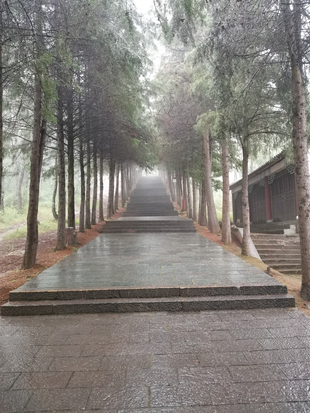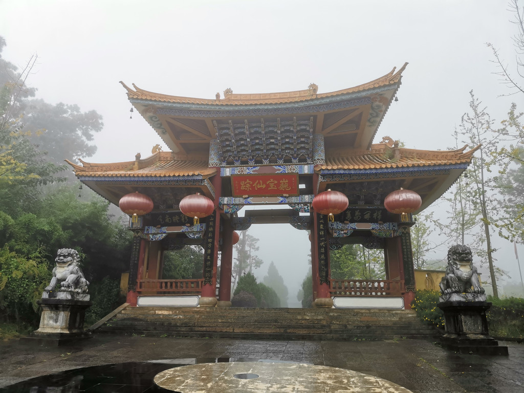 乘车上山,来到巍宝仙踪山门前下车前行,但见山上古木参天,浓荫葱郁,溪泉叮咚,花繁草茂,在蒙蒙雨雾的笼罩下,巍宝山有了一丝缥缈的意境。