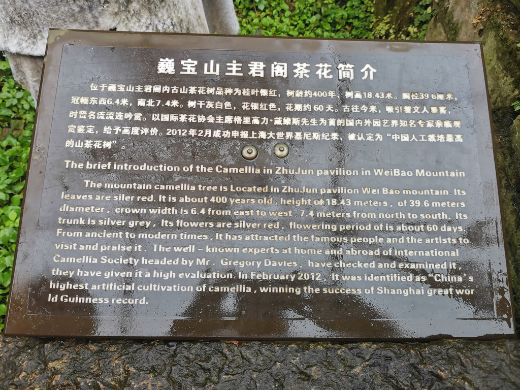 离开文昌宫,想起早晨在酒店看到一本有关巍宝山风物的书中提到灵宫殿内有一株高18米,粗39厘米,已生长400多年的云南最高的人工栽培古山茶树。问询导游谓就在附近,便想去看看,而同伴无游兴欲返,导游遂陪我一人前往。