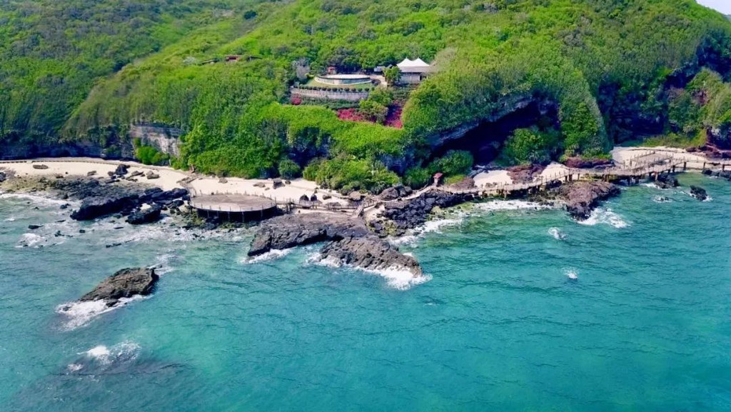 在高空鸟瞰,面积为25平方公里的涠洲岛犹如一枚翡翠漂浮于湛蓝的大海中。踏上这座火山岛,撞入眼帘的是奇特的海蚀海积地貌与火山熔岩景观---猪仔岭憨态可掬,鳄鱼石栩栩如生,滴水岩泉水叮咚,红色火山岩好象刚刚喷发过……位于盛堂村的 法国 天主教堂,更是在19世纪末就落户岛上,材料全部取于岛上的珊瑚、岩石,历经百年岁月,依然坚固如初。四百多年前,明代著名戏剧家汤显祖游览该岛,写下“日射涠洲廓,风斜别岛洋”的诗句。