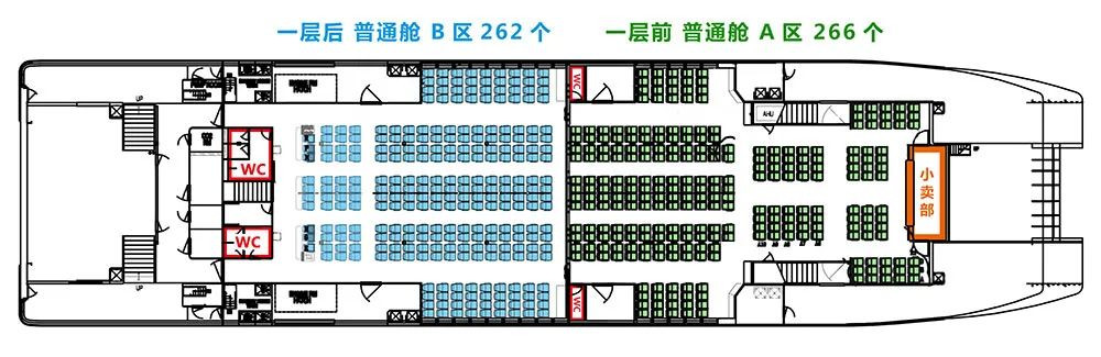 一、北游12普通舱B区位于客船第一层船尾,共有262个座位,票价150元/张,窗户小也比较少,很难看到海景;普通舱A区位于客船第一层船头,共有266个座位,票价150元/张,窗户小也比较少,几乎看不到海景;