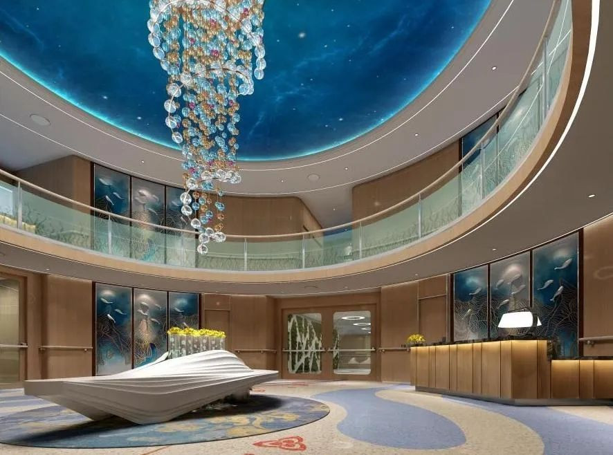 当你步入北游25游船内部时,首先映入眼帘的是波浪纹抽象图案地毯和贝壳造型图案,整个大厅以时尚、年轻、活跃、海洋为主题,中空圆形大堂让人仿佛进入到科技海洋世界。