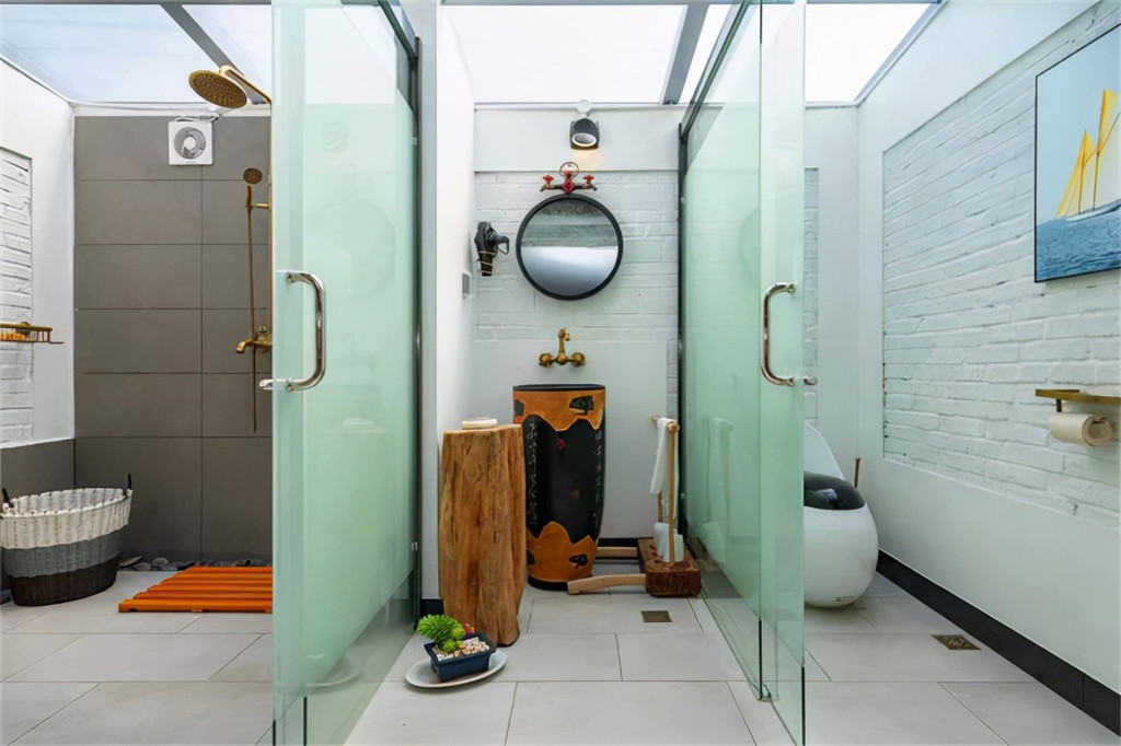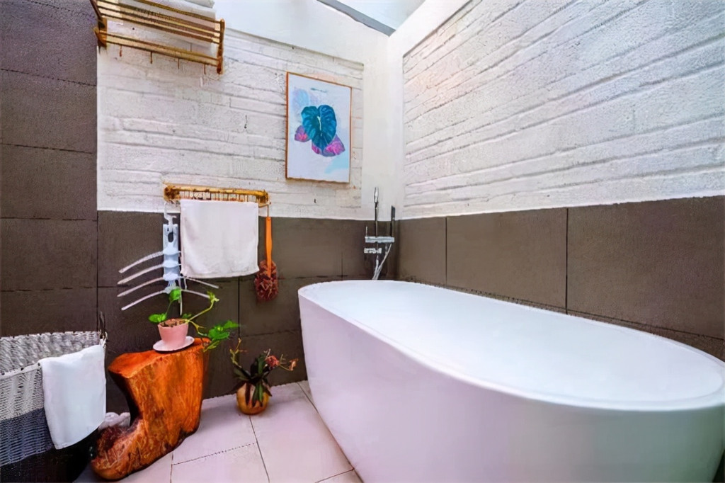 这里占地两千三百多平方,有23间房,可以接待50人住宿。码头来回可接送。每间房的一楼都是风格迥异的客厅(榻榻米、沙发等),洗浴间、洗手台、厕所等借鉴日式风格干湿分离,楼梯与二楼卧榻选用高级原木地板(为了保护木质记得换拖鞋哟),还配备了浴缸可供泡澡(提供一次性泡澡袋),非常精致。