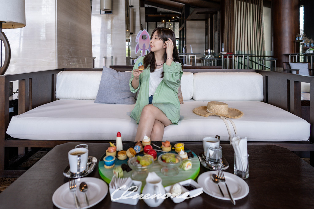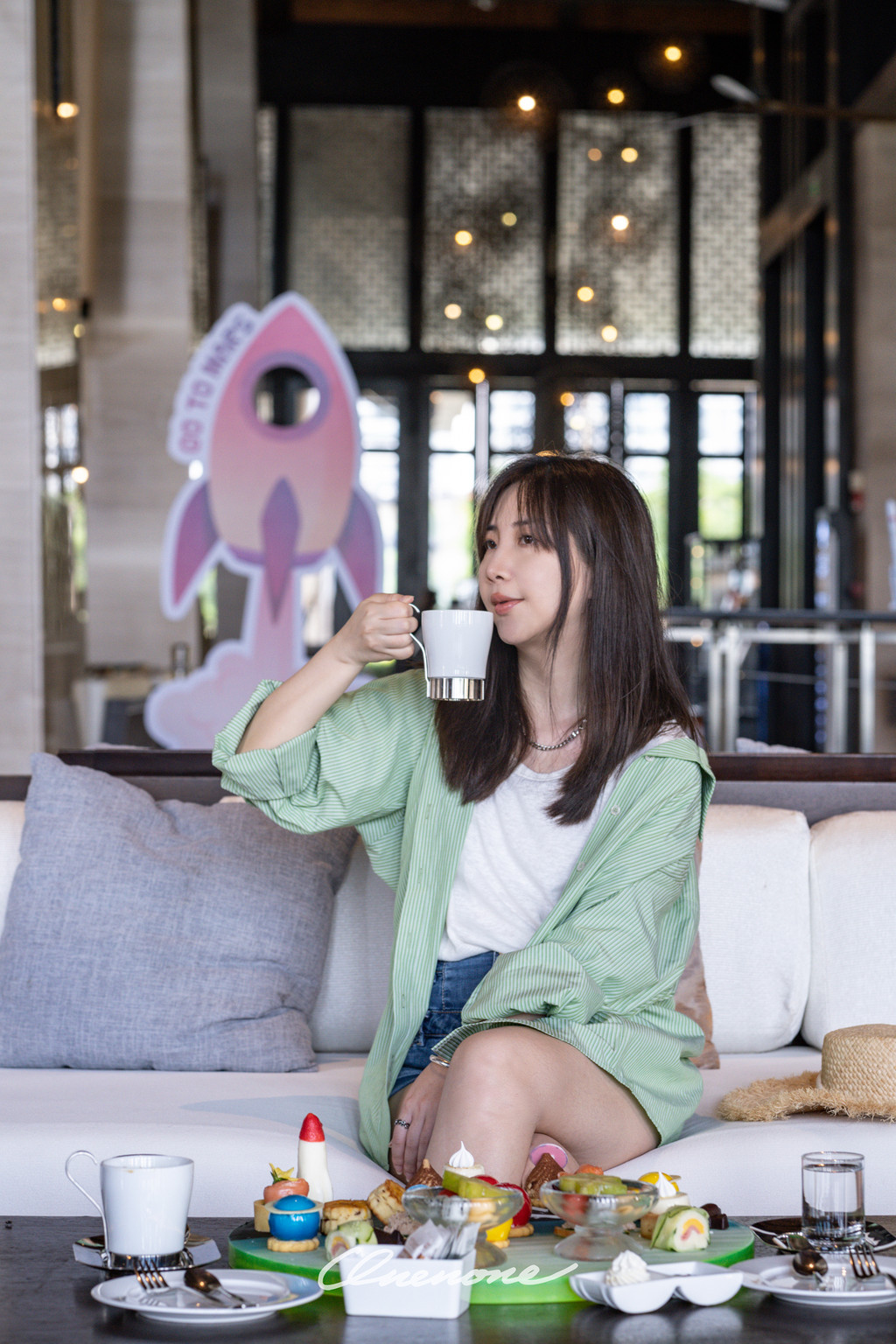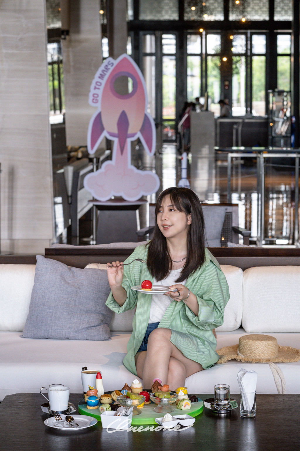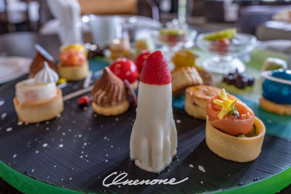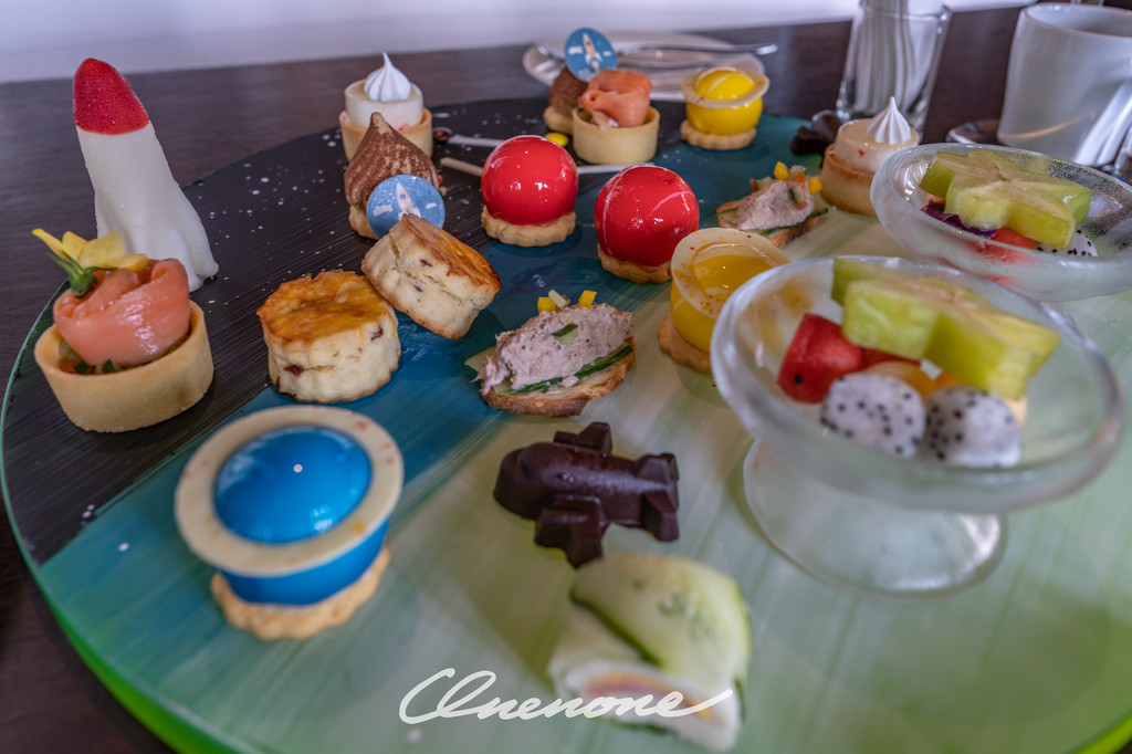 作为一家航天主题的酒店,我当然不会错过航天主题下午茶:烟熏三文鱼蔬菜塔、青瓜火腿芝士三明治卷、法式开心果鸡肉特林、炙烤巧克力&热情果慕斯蛋糕、芒果芝士、香草&莓果慕斯、布蕾挞、苹果香缇奶油蛋糕、司康饼、季节鲜果杯、饮品。这哪里是下午茶,简直就是将璀璨星空、宇宙银河、迷幻星球等融入到各式甜品中,由味蕾直抵心间,亦真亦幻。我要说这份下午茶是颜值、口味双在线,真的一点都不夸张。