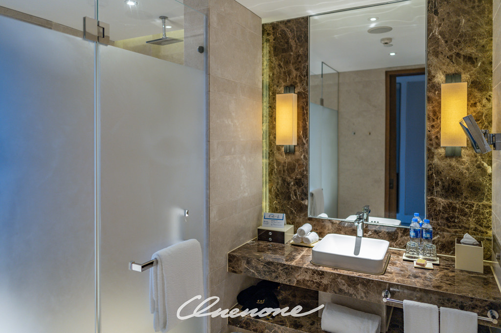 卫浴洁具:全套淋浴、花洒、马桶、浴缸、洗漱池、水龙头品牌科勒Kohler。别的不说,科勒的淋浴花洒采用先进“亲氧”水流科技,将空气自淋浴顶部快速旋吸入花洒中,与水流充分结合,使水滴如雨水般轻轻洒落,出水充沛均匀,如云雾轻柔集中,让身体得到彻底放松。淋浴间配置的雾化玻璃和推拉门,对于入住宾客的隐私起到双重保护作用。