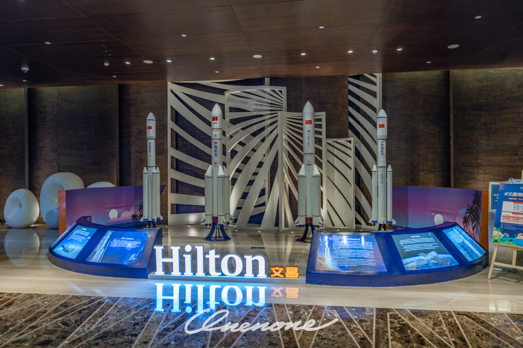 酒店与中国航天科技国际交流中心联合打造3个航天主题展区,展示的火箭模型均获得了中国航天科技集团有限公司第一研究院的授权。1层開全日制餐厅外的公共区域为火箭主题展区,展示了4个1:20高仿真火箭模型,即在文昌航天发射场服役火箭:长征五号、长征五号B、长征七号、长征八号,辅以椰林海浪等元素作为背景,宾客可在椰林碧海下见证中国尖端科技。通往1栋客房区域展示了1:50文昌航天发射场景观,包括转运平台、发射塔架和长征五号火箭,还原了真实发射场景。大堂通往海天阁中餐厅的长廊为航天科普水晶展板展示区,展示包括中国火箭发展史和空间站的相关介绍。3个航天主题展区,为宾客提供了一站式航天科普体验,不出酒店即可了解中国航天事业的蓬勃发展。听说酒店会定期特邀航天专家为各位拥有航天梦的大小宾客带来航天科普小课堂讲座,点燃航天梦想,弘扬航天精神,拥抱星辰大海,同时也践行了酒店的社会责任。