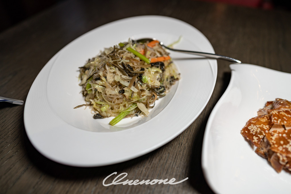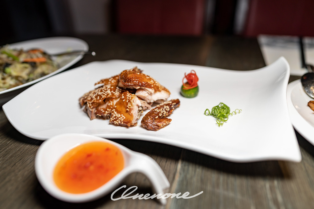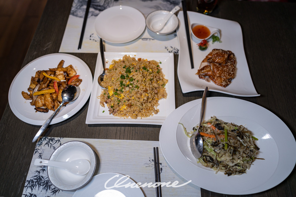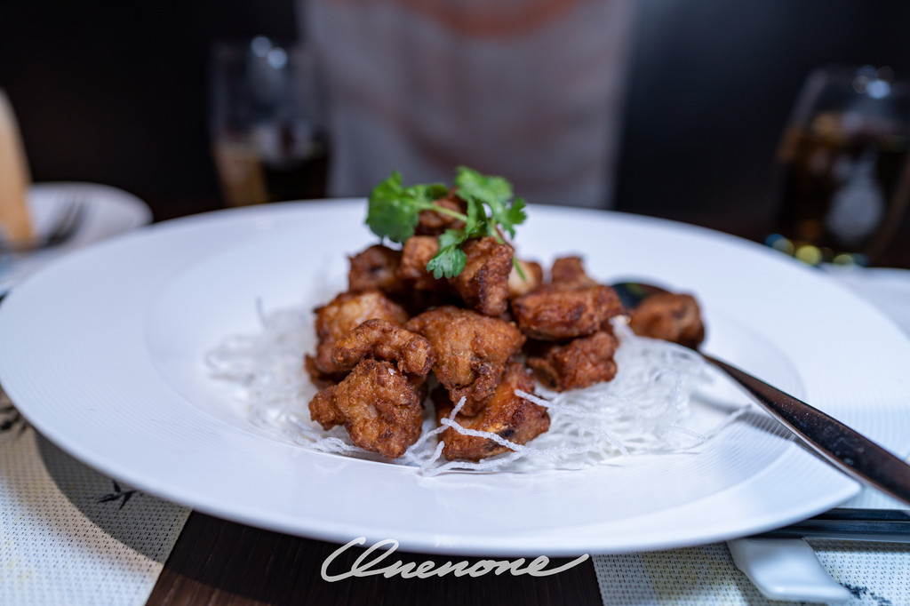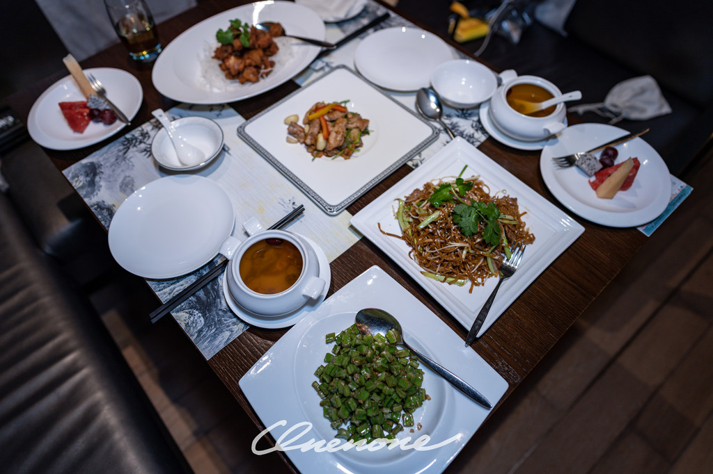 两顿晚餐,我简单品尝了以下这几道菜品:风沙吊烧鸡、椰菜炒小咸菜粉丝、咸鱼鸡粒炒饭、葱汁鳕鱼爆爽肉、香煎果园文昌鸡、藤桥炸排骨、椰菜肉沫炒四棱豆、干炒牛河、虫草花排骨汤、水果拼盘。风沙吊烧鸡的制作工序讲究,前期腌制10个小时,再风干一个晚上,第二天烤熟。这样做出来的吊烧鸡肉质鲜嫩多汁韧性十足,调料香味完全融入骨肉之中。咸鱼鸡粒炒饭米饭颗粒分明,咸香不腻。葱汁鳕鱼爆爽肉,将鳕鱼的入口即化和猪颈肉的嚼劲完美融合,葱汁提味起鲜。椰菜口感脆爽,适合搭配各种蔬菜食用。香煎果园文昌鸡充分利用了文昌鸡油脂饱满、肉质细腻的特点,油煎的烹饪方式出品更加外焦里嫩,香气扑鼻。藤桥炸排骨,也是海南名菜之一,关键是食材取自本地农家自养土猪的新鲜排骨,外表色泽光亮。排骨用盐、胡椒、姜蒜汁、蜂蜜等调料腌制1个小时后,再放入锅中用慢火油炸至熟,成品色泽金黄、甘香四溢,入口鲜咸微甜、酥脆爽口。这道菜对于油品质量和油温火候控制十分讲究,可见厨师技艺之娴熟。
