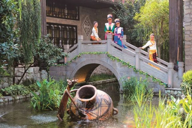 古朴的羌族特色建筑屹立街道一侧,潺潺的小溪从石板拱桥下流过,岸边春风吹过,杨柳飘飘,花香四溢,漫步于此,尽享丽江的浪漫与无忧。