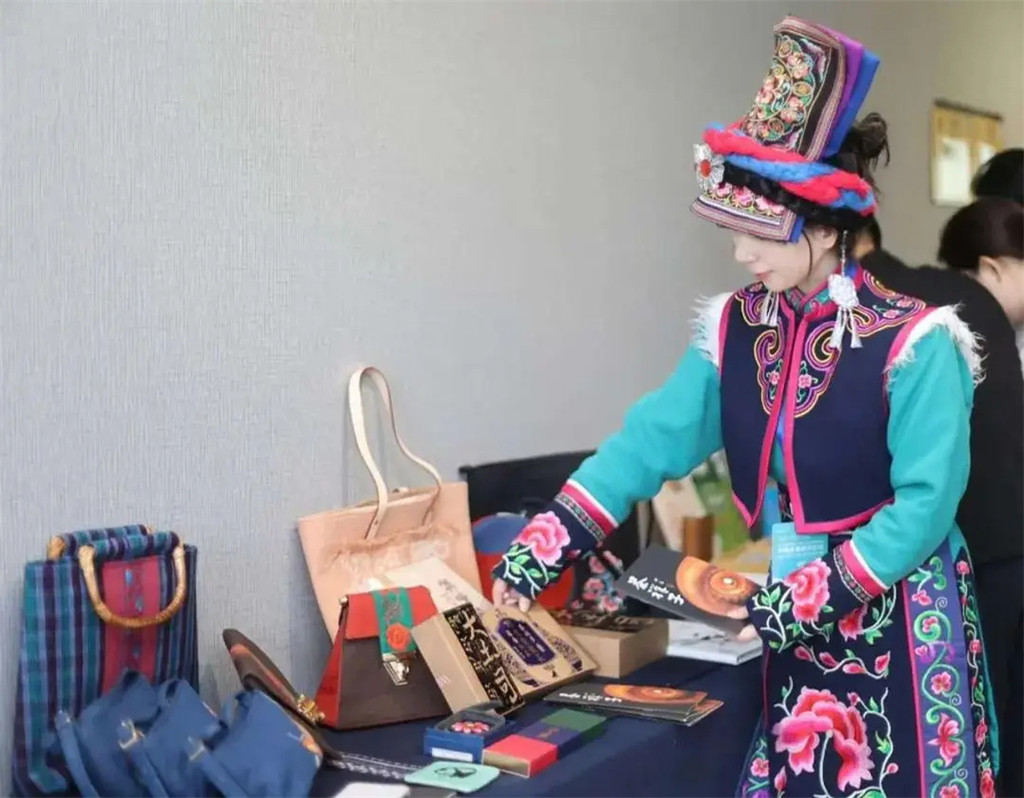 在2024年中国消费经济论坛暨第四届中国文旅消费研讨会展品区:做工精细的羌绣系列文创产品、汶川传统非遗藏茶、熊猫IP系列文创等,熊猫元素、民俗风情尽显,让大家对汶川旅游资源及亮点有了充分了解。