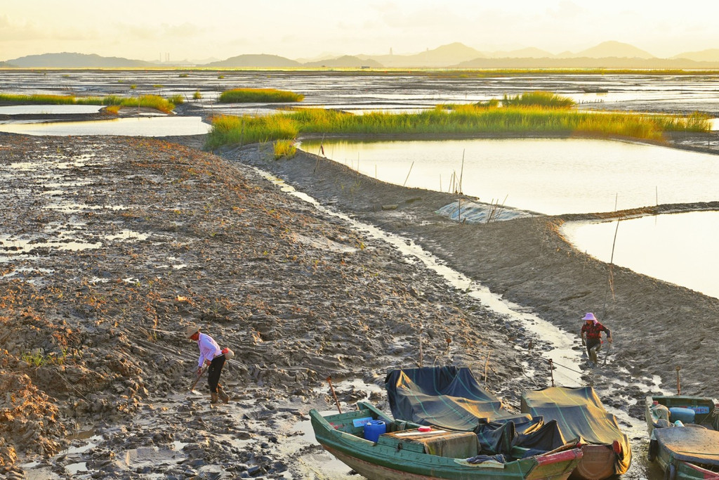 而每日潮退之时,总会迎来一波又一波的养殖户和捉鲜人,泥里淘金,在暖阳之下,犹是一幅幅赶海丰收图。