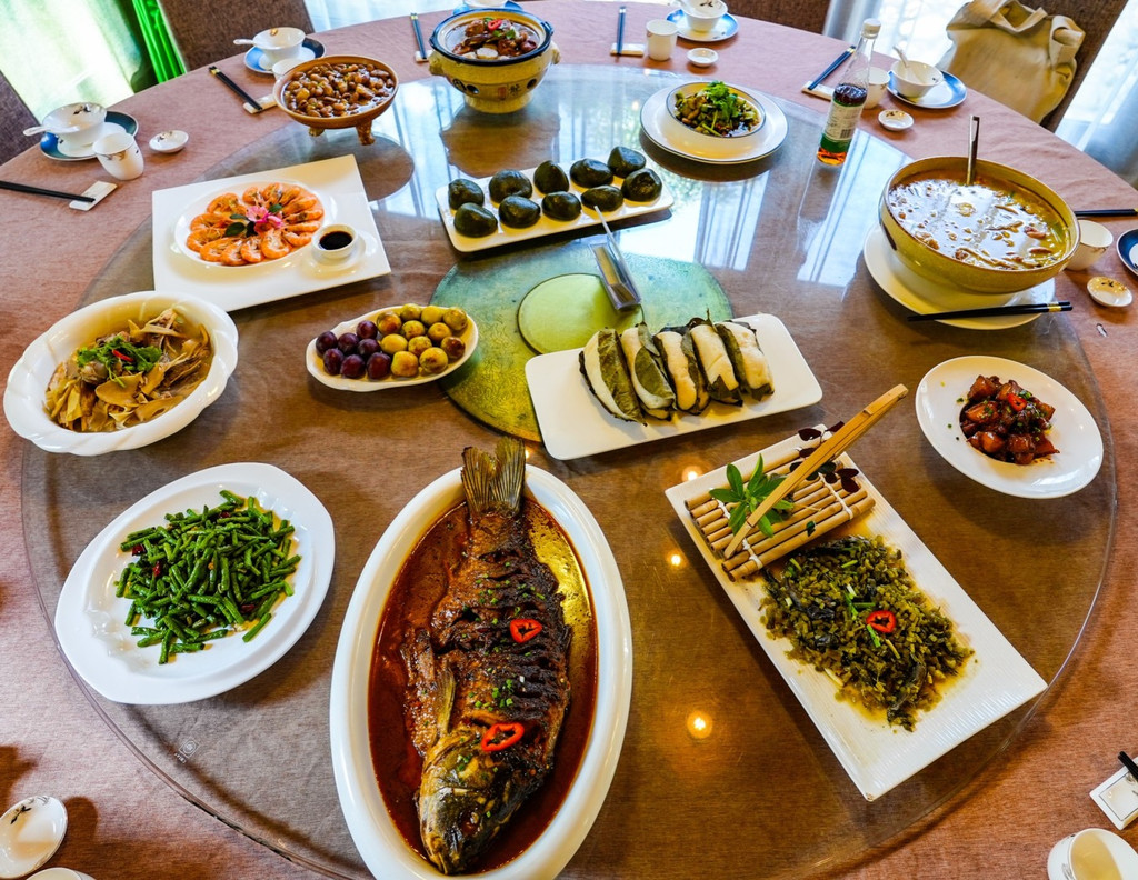这次在山谷民宿的垕山里餐厅好好品尝了一下这著名的“花坞八大碗”。 包含有夫妻跳鱼、红糖鲤鱼、潘家鸡面、坞根豆子芽、芋艿老鸭、溪水明虾、婆婆烧肉等等。
