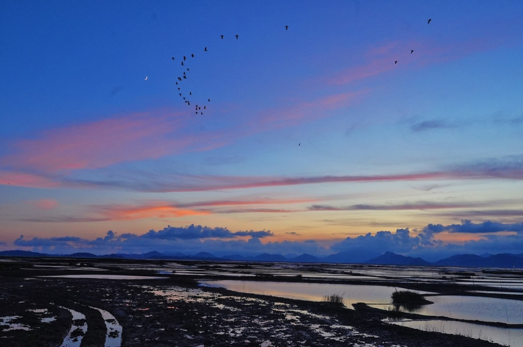 夕阳西下,滩涂上,白鹭时而驻足觅食,时而自由飞舞,和落日余晖、天边云霞一起共奏成一首秋日乐曲。于是坐在堤坝上,吹着晚风,看云卷云舒,看螃蟹在泥里穿梭,感受着这如诗如画的一切。心中唯余美好。