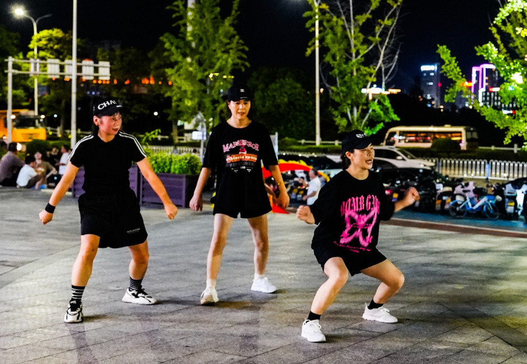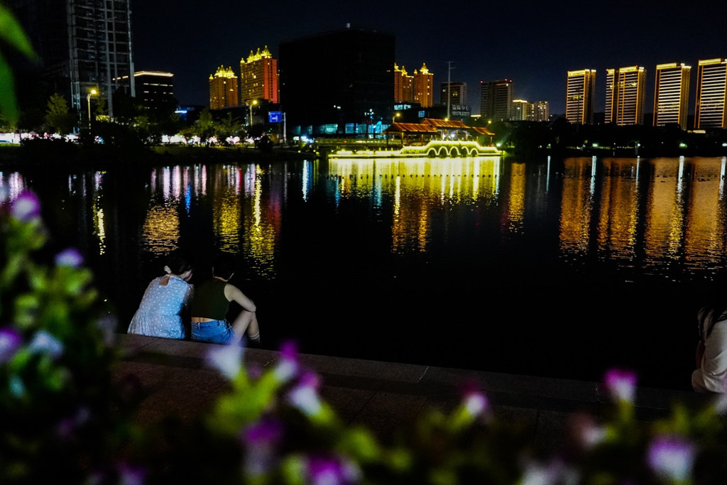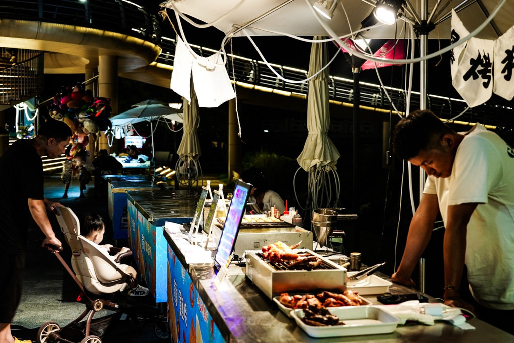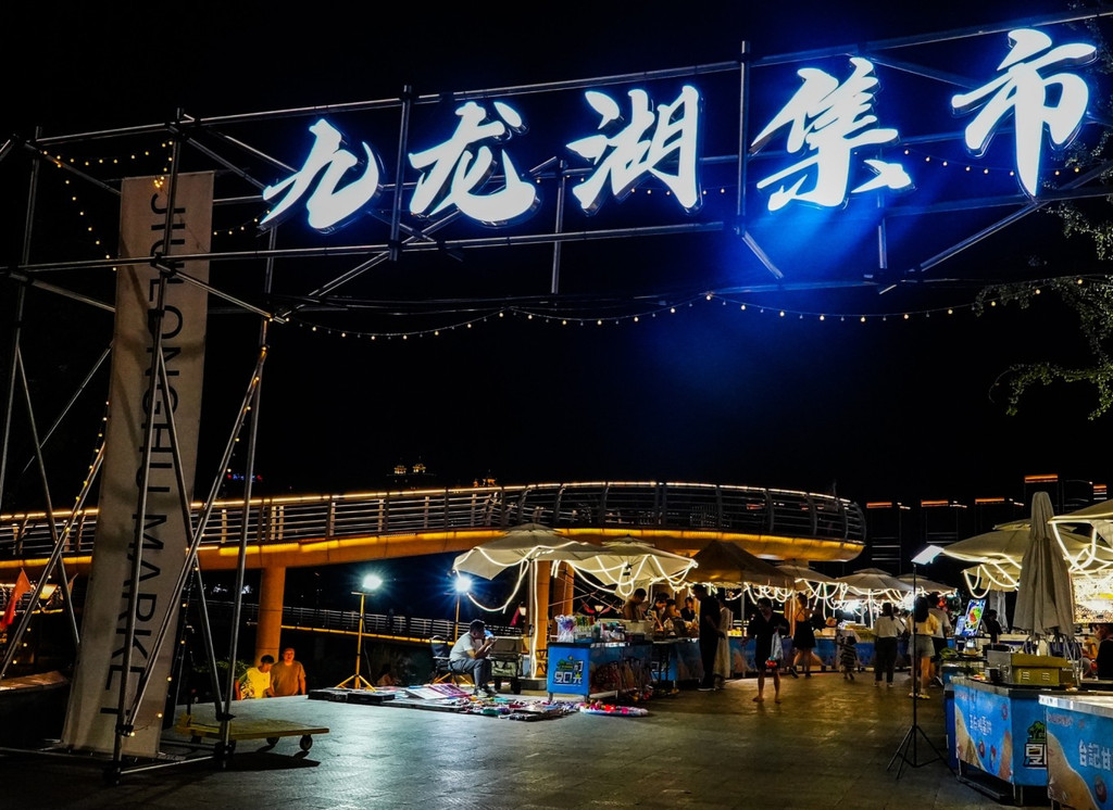 九龙湖市集烟火升腾,吸引着夜游的人们,年轻人正在路旁跳街舞,情侣依偎在湖边欣赏这夜色之美,这一切的欢笑声、谈话声,与湖水和微风的声音交织在一起,形成了一首美妙的交响乐。