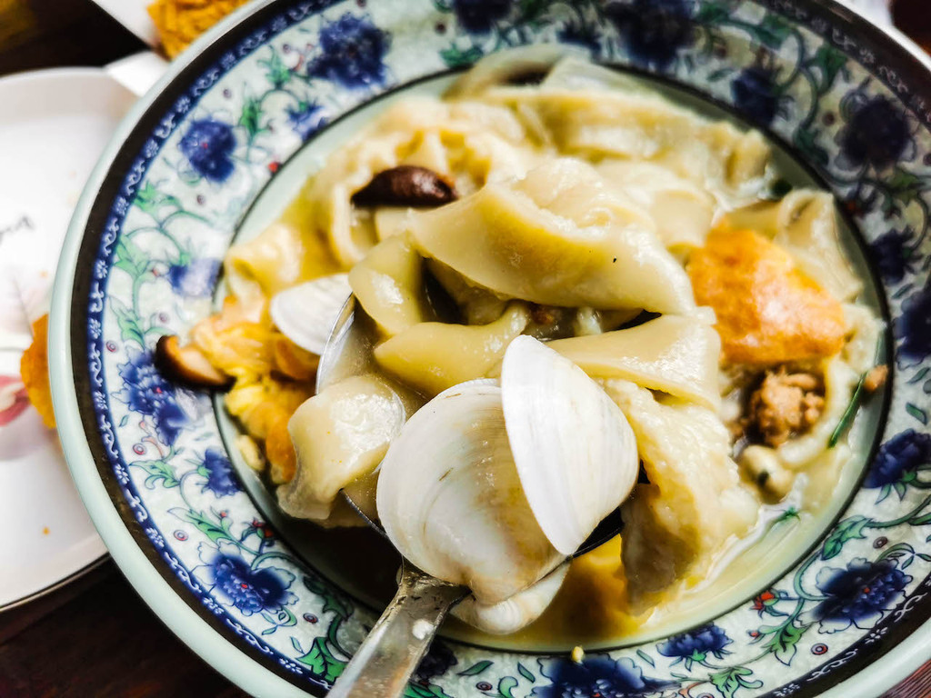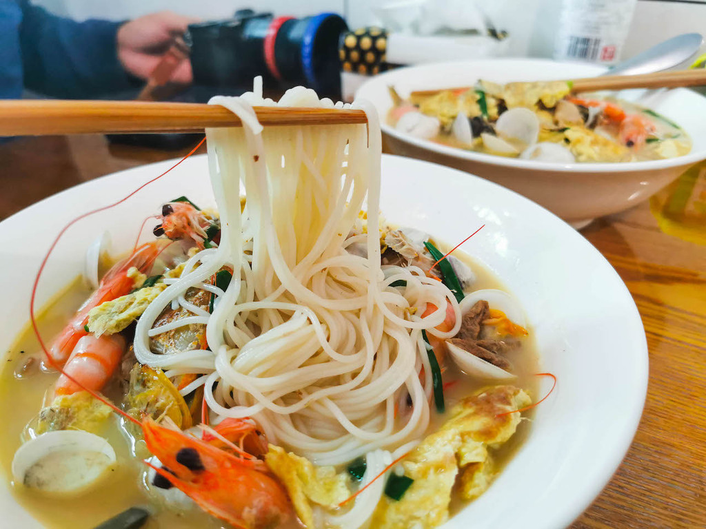 如果只能选择一种食物代表清江,那一定是三鲜面了。而孙国花是清江三鲜面的创始人,也是三鲜面非遗文化的传承人。这里的三鲜面和外面的还真不一样,里面的食材也太丰富了吧,小黄鱼、跳鱼、虾、牡蛎、蛏子、姜丝蛋散、肉丝,一大碗面,光吃这些海鲜就要吃半天,再加上他们秘制的汤底,鲜香爽滑,真的是舌尖上极致的美味汇聚在一起了。