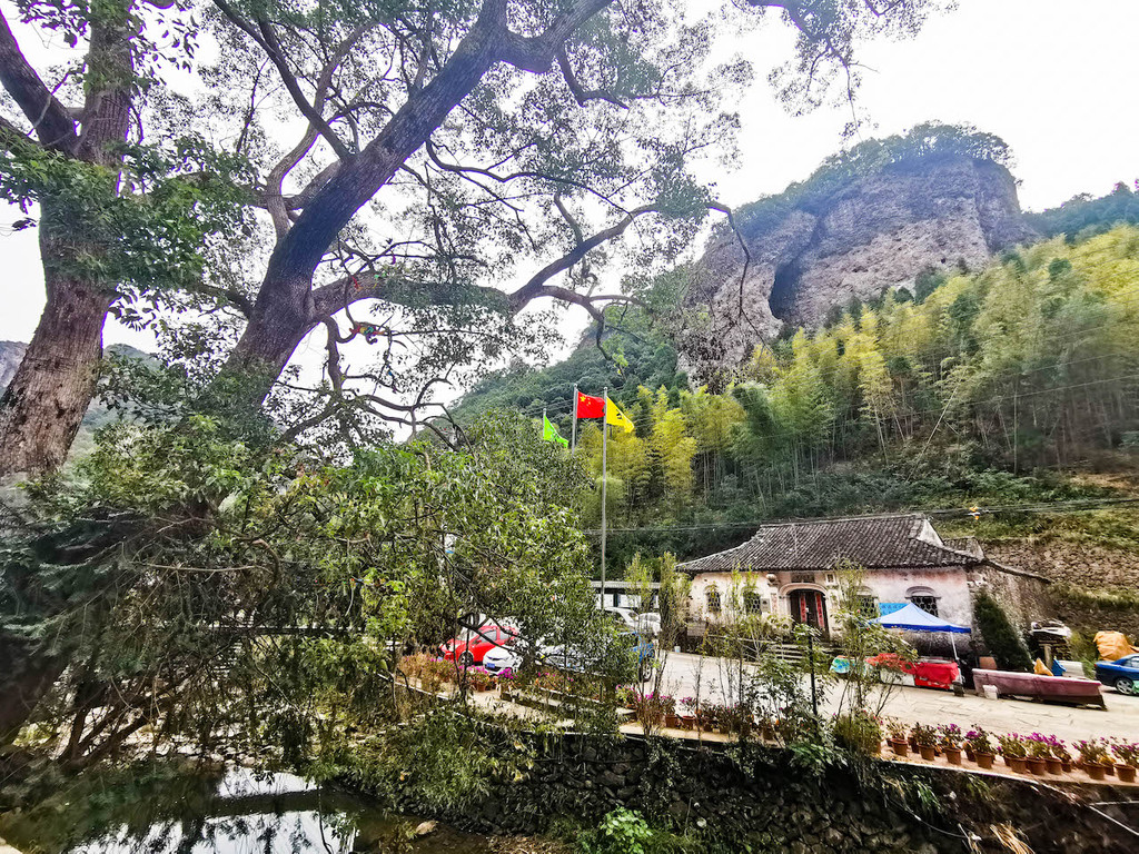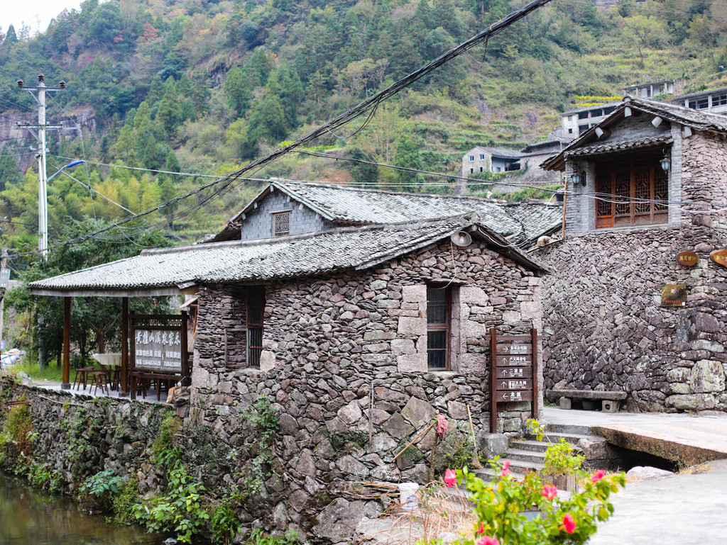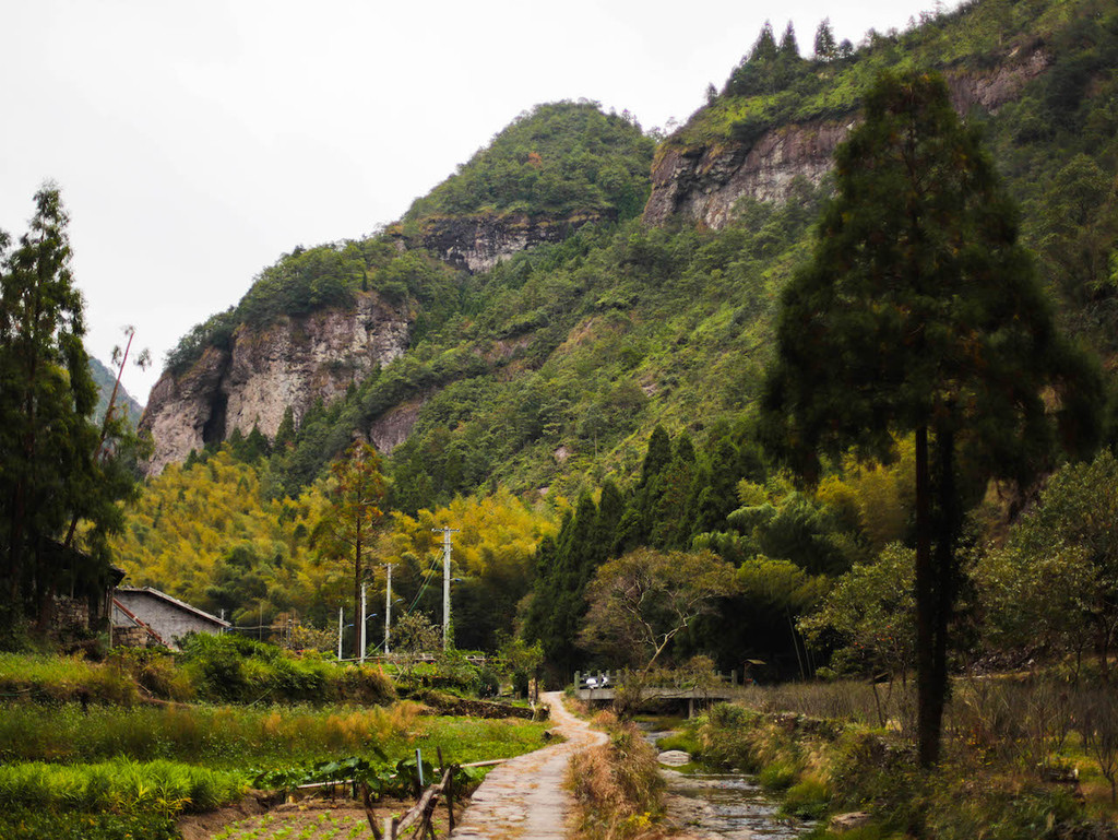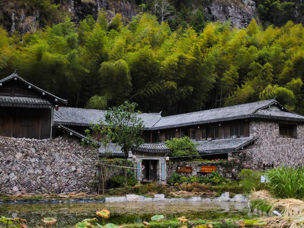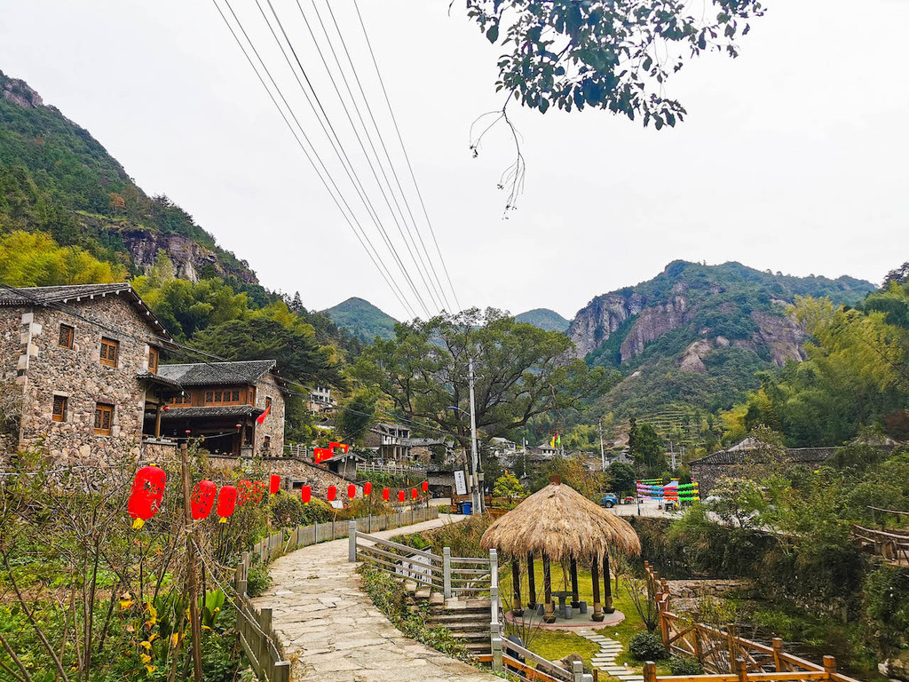 村子始建于宋代,距今有800多年历史了,坐落在雁荡大山之中,四周群山环绕,南北两边石壁陡峭,高耸入天,龙游溪穿村而过,溪水的河床都是一块块的山石,这里竹林茂密,即便是在天气不好的时候,这一片片的绿色,足以疗愈一切,都说这个隐藏于浙南崇山峻岭中的古山村,俨然一座世外桃源,一点都不夸张。