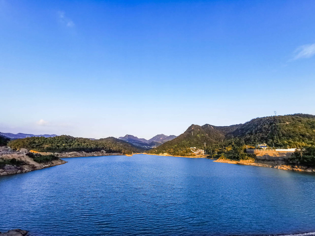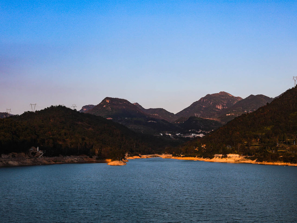 吃饱喝足,就向着我们晚上住宿的黄檀硐古村前进,途径中雁荡的钟前湖,正好是傍晚时分,这蓝天之下的钟前湖,蓝如宝石,夕阳下的钟前湖美极了,吸引了很多人前来打卡。