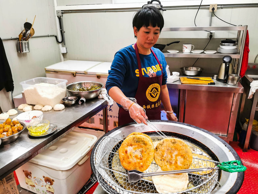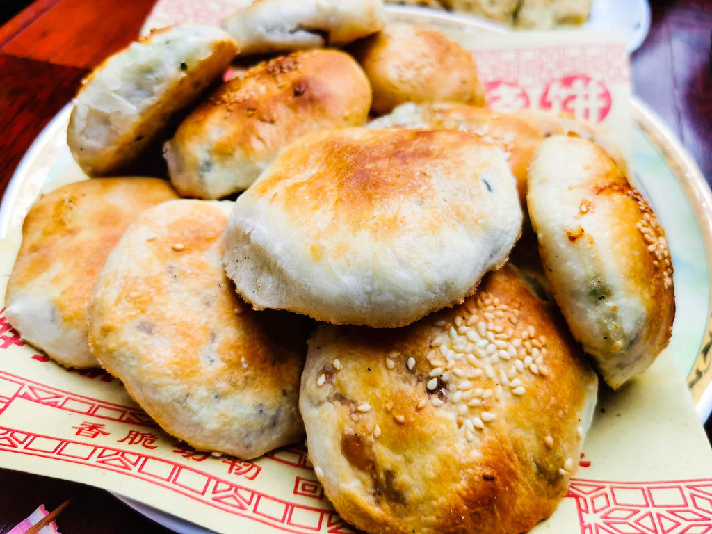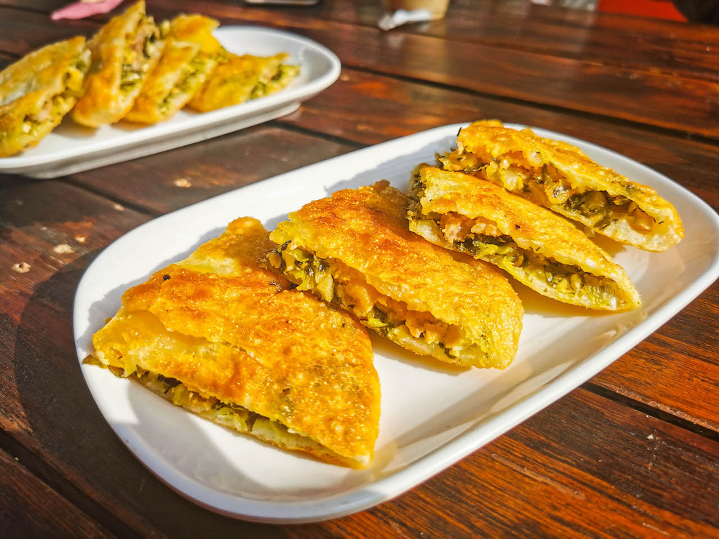 还有这个芙蓉麦饼,也是乐清当地的特色小吃,用面团,包裹住肉、咸菜、蛋花、葱,然后烤出来,切成一块块的方便大家吃,真的是外面饼很酥,里面的馅儿又香又丰富。