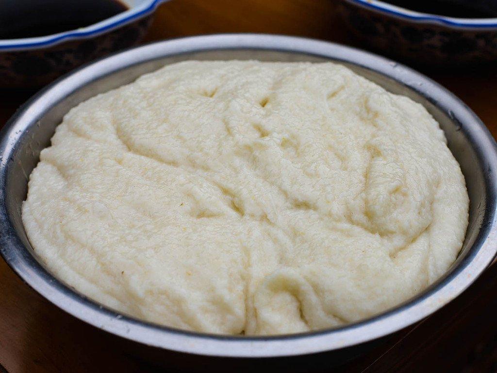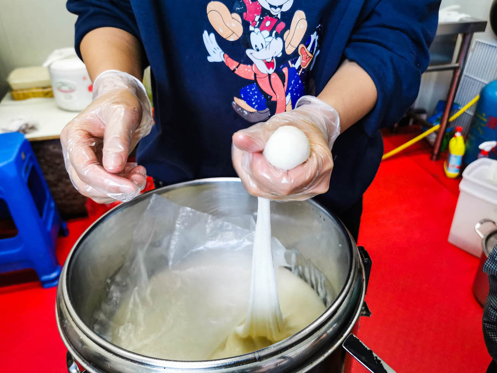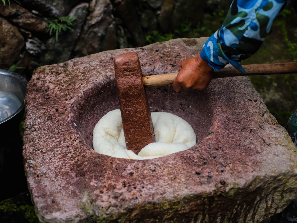 第二天早上起来,老板还在院子里为我们手工打做麻糍。手工打麻糍真是个体力活,一大盆糯米放在石槽里,用实打实的石头锤敲一下,翻一下,最后成就了美味的麻糍。当地人吃麻糍,是将红糖姜汁做成浇头,淋在白花花的麻糍上,一口下肚,又糯又香又甜。