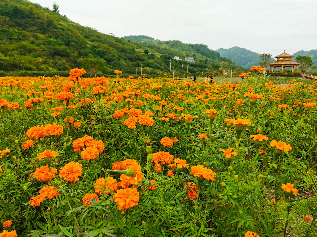 金灿灿的硫华菊、轻盈的格桑花、少见的红色向日葵,还有百日菊、鸡冠花、鼠尾草、千日紫、醉蝶花、粉黛乱子草、薰衣草等网红植物50余种,种类非常丰富。穿梭在花海中的是3000米长的旅游栈道,我们游走在不同的花海里,无论你是多大年纪的人,都能激发出那颗少女心。
