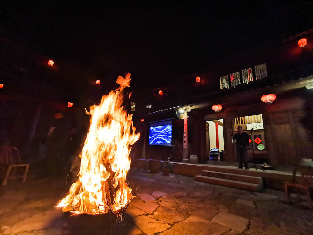 晚上的篝火晚会真是热闹非凡,大家围坐在院子中间的篝火旁参与徐掌柜主持的各种活动和表演。说到徐掌柜,他是一个有很多故事的人,将自己的故事编写成一首首民谣,他在这里,就有美妙动人的歌声,听的人如痴如醉。