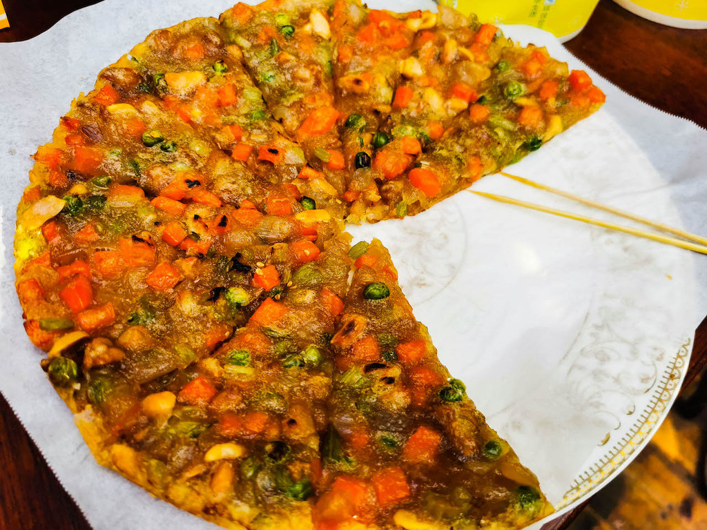 鹅头颈,就是乐清的土披萨,食材包含有洋葱、红萝卜、青豆、芹菜、瘦肉、花生、芝麻等健康的食材,出锅以后切成一片一片的,感觉比西方的披萨好吃多了。
