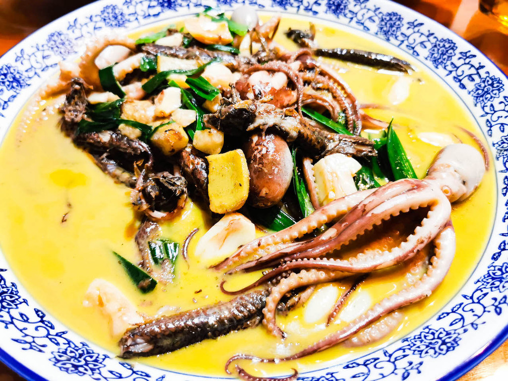 还有这个望潮跳鱼,这也是他们家的主打菜了。端上来,我们以为就是八爪鱼,但老板娘介绍说,这是望潮,望潮一般指短蛸,是一种小型章鱼,一般体长15~27厘米。跳鱼也是海边生物,两种搭配在一起做出来的菜,鲜香皆具,一边是望潮的Q弹,一边是跳鱼的鲜嫩,味道自然好极了。