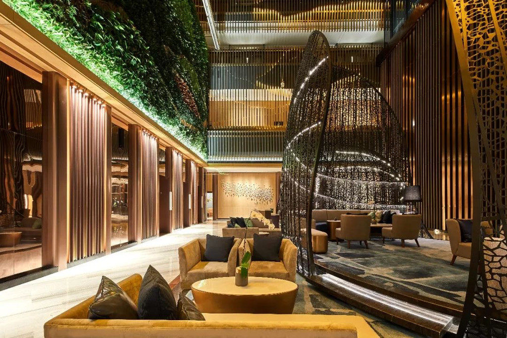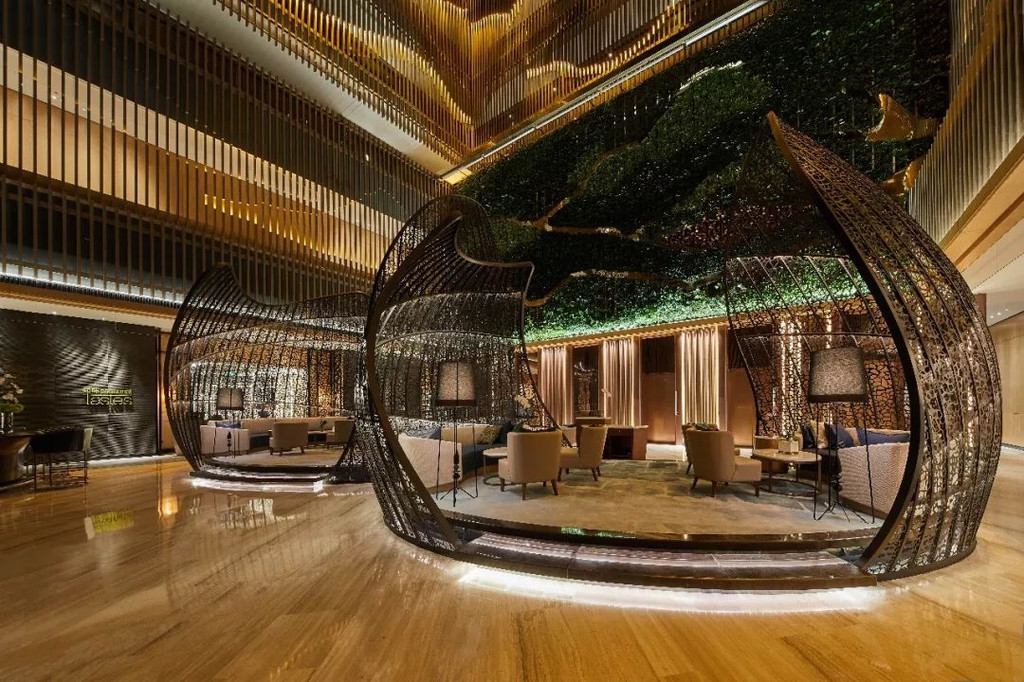 酒店位于置信大厦的35层至52层高空,刷新温州酒店新高度。挑高78.5米的中空大堂,给人别样的视觉冲击。独树一帜的50平方米绿植墙是由美国威尔逊室内建筑设计公司所设计,将自然与建筑相融合,在繁华都市中呼吸大自然的气息。
