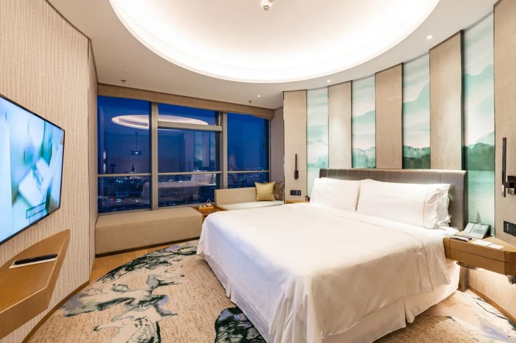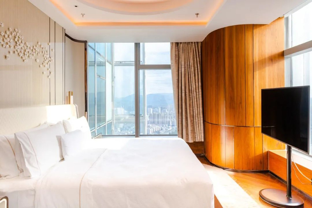 在35楼大堂办理好入住手续后,换乘客房电梯抵达本次所下榻的楼层。客房设计充分运用高空建筑的优势,利用全落地玻璃窗借景,将窗外的风景引入客房,形成一幅壮美的画卷。