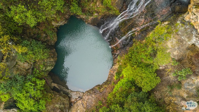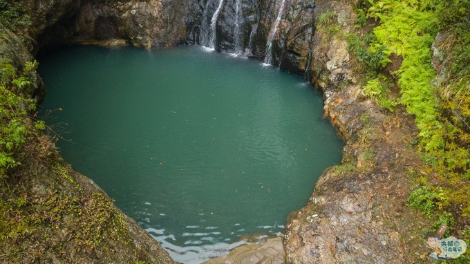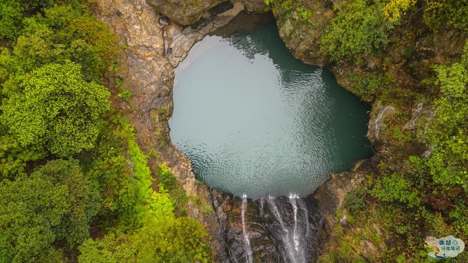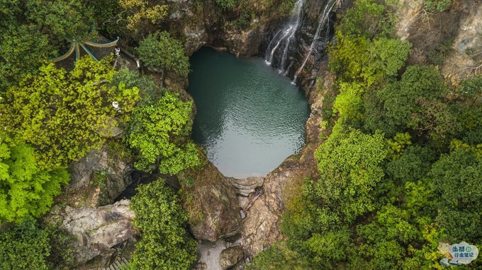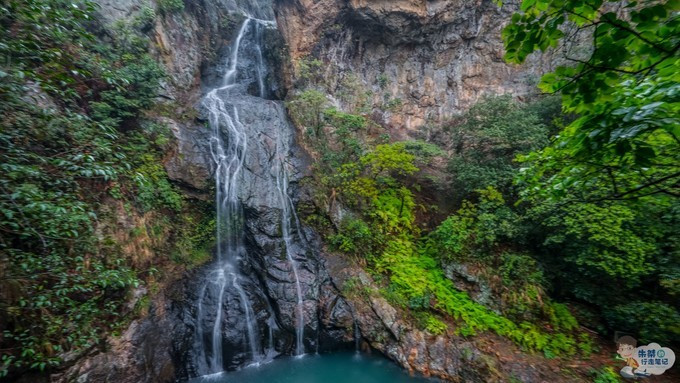 梅雨潭是一个瀑布潭。远远望去,梅雨潭的瀑布狂奔直下,梅雨亭坐落在瀑布前一块突出的巨石之上,非常显眼。潭的形状像“一张极大极大的荷叶铺着”,面积约300平方米。水源主要来自潭北悬崖峭壁间飞洒直下的瀑流。瀑布落差约30米,瀑流与岩面的撞击,溅飞的水花像点点白梅纷纷飘洒。人立潭边,那“晶莹而多芒”的水花扑面拥怀,让你恍然走进了 黄梅 细雨天。一年四季,天天如是,故名“梅雨潭”。一个“绿”把梅雨潭的水“洒”向全国,滋润了多少游人的心。