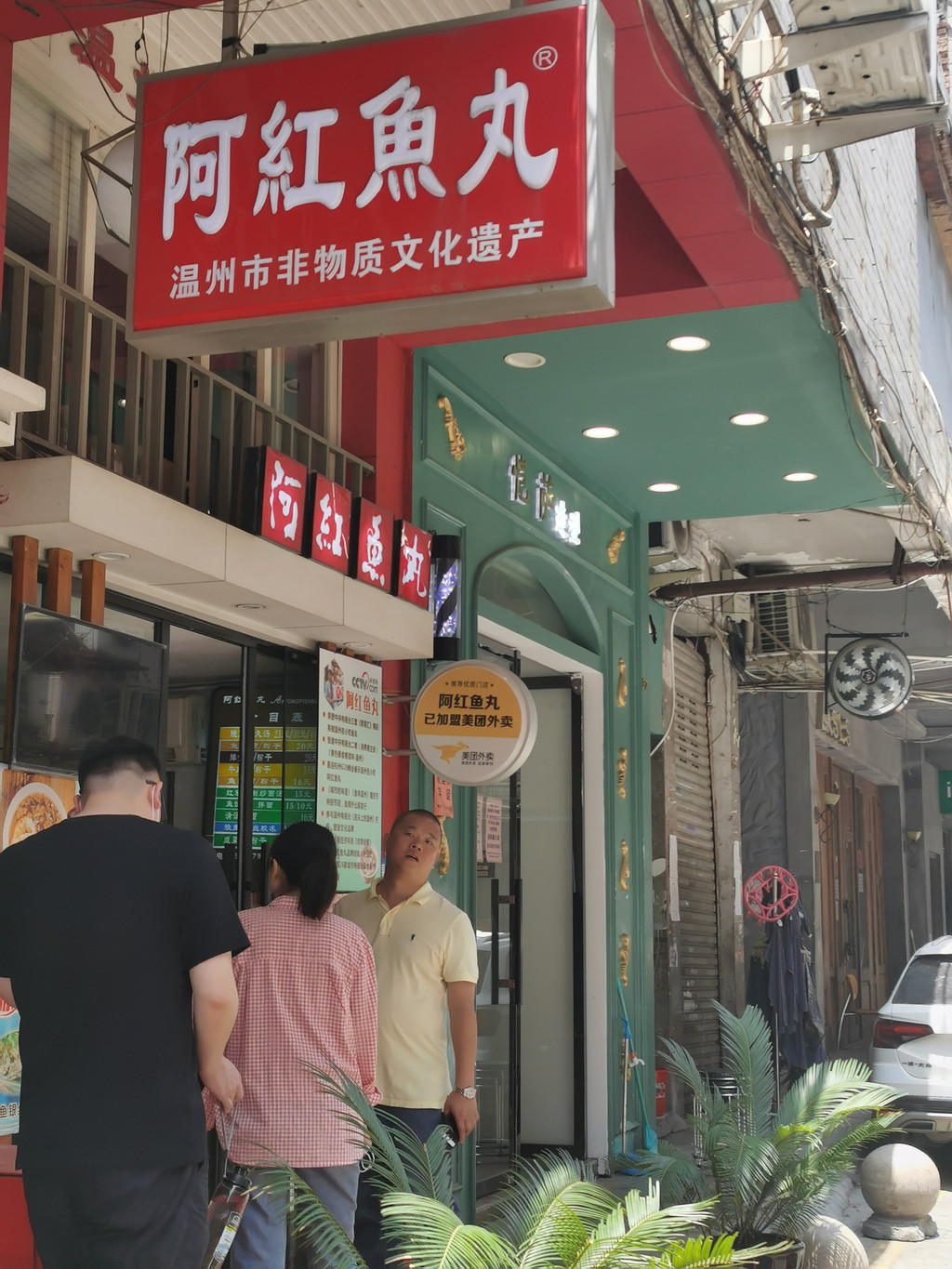 瑞辉馄饨不远,就是阿红鱼丸店,温州鱼丸和大馄饨一样,都是来温州必须一尝的。说是鱼丸,其实一点也不圆,而是一条一条的鱼块,问店家,说选用东海大鮸鱼,加入肥膘肉、姜末、葱花,用手不断摔打而成。吃在嘴里满满鱼的鲜味,而且每一条鱼丸里面都能吃到大块的鱼肉,这个真是实打实的鱼丸。吃温州鱼丸,标准的吃法是要加醋和胡椒粉,一碗酸酸辣辣又鲜甜的鱼丸汤,据说是温州人酒后醒酒最好的恩物。