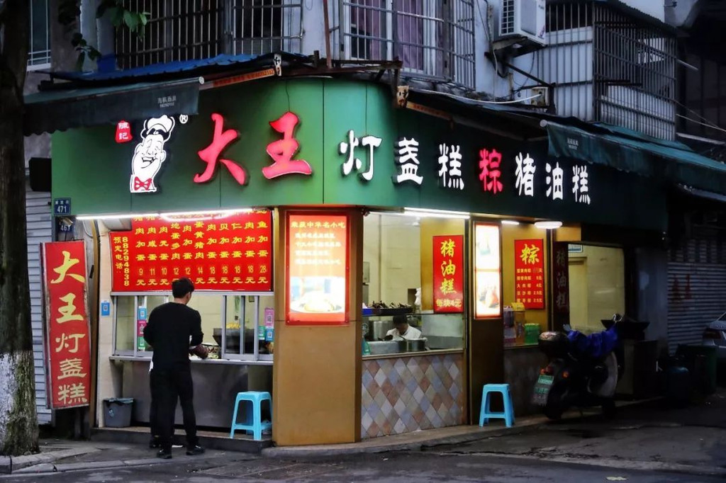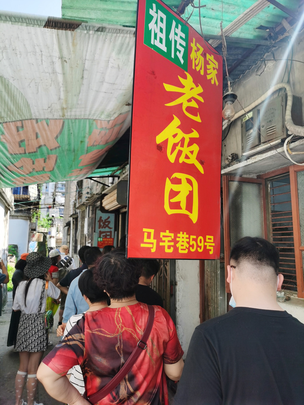 过了九山路,就能看见一条排着长队的巷子,巷口一家饭团店,是上了央视早餐介绍的,不过本地朋友告诉我,本地人真正认的,是巷子里面那家杨家饭团。果然拐进巷子,里面排着更长的队。想吃好吃的只能老老实实的等着,花了半个多小时,直接买了甜咸二个味道的。甜的里面是芝麻和脆油条,咸的则是香菇肉沫、肉松、油条,额外花钱再加了一个蛋黄。