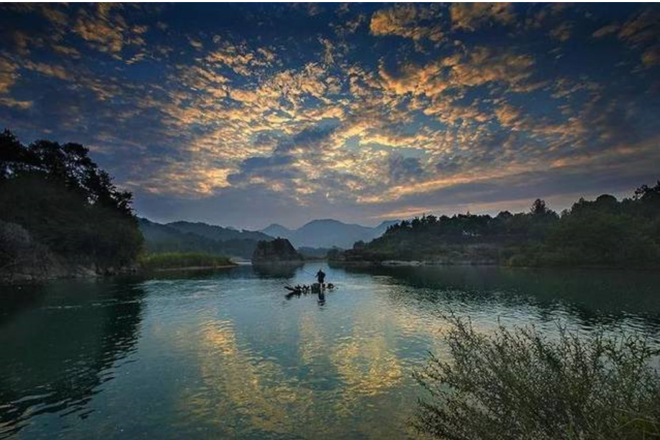傍晚时分,风吃过来凉凉的,把鞋脱了光着脚丫泡在水里,让竹筏带着我们顺流而下,两岸的青山温柔,江边的滩林静谧,太阳慢慢的将天边染红,江上渐渐的波光粼粼,恩,这一刻,都市的车水马龙都已经远去,只剩如山水画一般的田园。