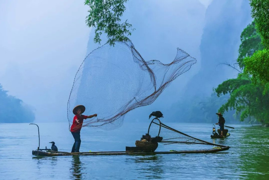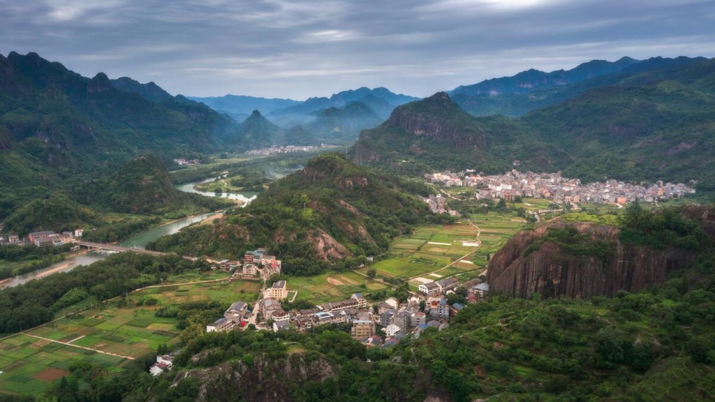 在碧蓝的江水两侧,是翠绿的稻田和古意盎然的村庄