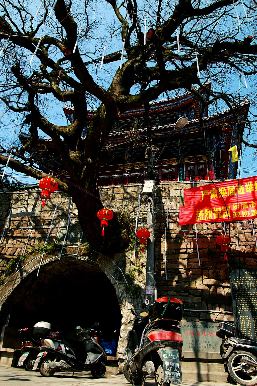 晌午上路,吃个炒粉,本想拍屁股走人,观众们说,去七里港为啥舍近求远,走疏港大道多顺。没办法,只好折回蒲岐镇。穿越古镇,小捷似乎刷存在感上瘾,又爆胎了。看来,不怀古就别想走。既爆之,则逛之,蒲岐之古,如假不换——想换也没地儿换啊。我像一阵风,无意刮过,意外邂逅,云散无痕。
