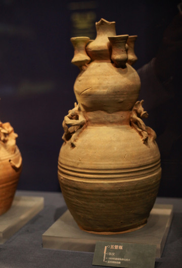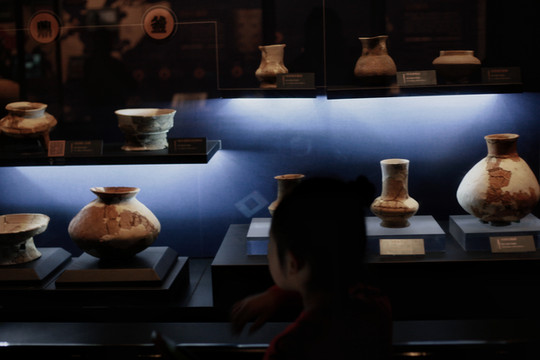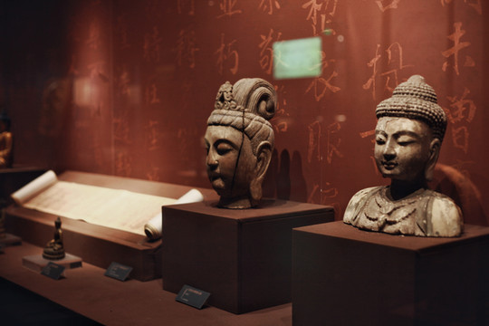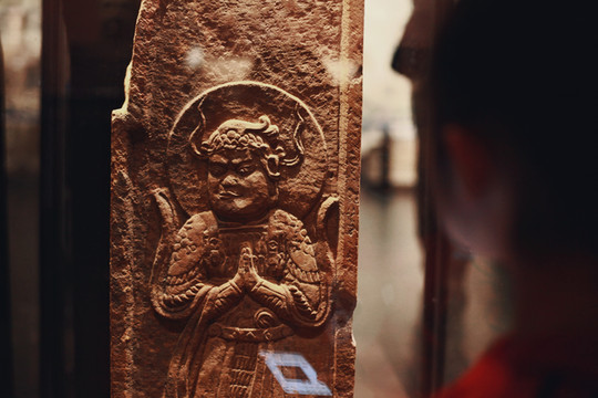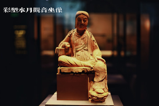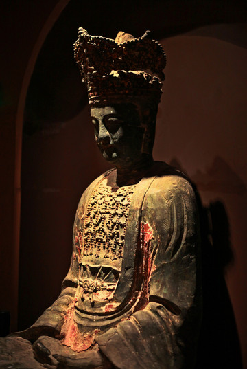 一楼的历史展厅中,白象塔有一尊北宋彩塑菩萨坐像最让我喜欢。这是一件北宋政和五年的文物,曾经被供奉在塔的二层。这尊菩萨的雕刻非常精细,头梳矮平髻,中分刘海,面部圆润丰满,五官秀气。上身披淡灰色广袖袈裟,细细看的话还可以看到盘花纹样,内搭石绿色糯衣。