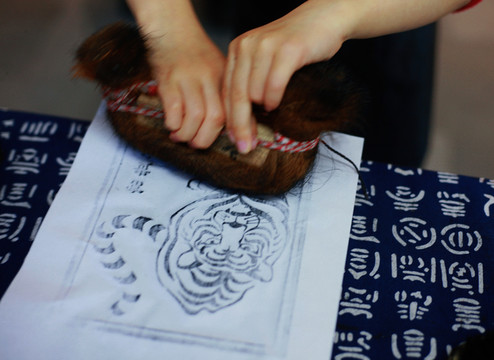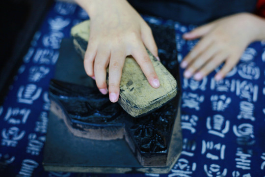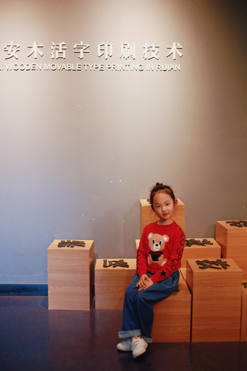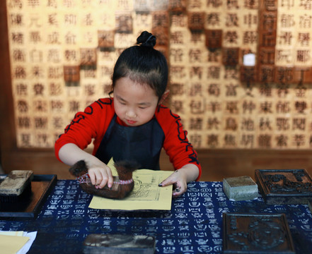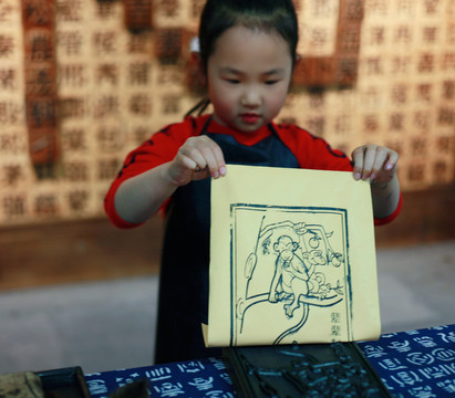 玥体验木活字印刷中上墨、上纸、印刷的步骤,颇有成就感。