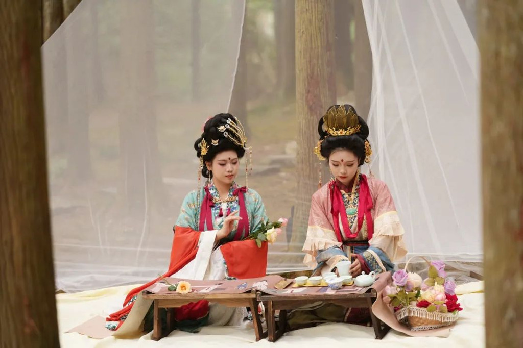 漫步景区,绿植密布,仿佛置身大氧吧,丛林里邂逅身着汉服的表演者或低头品茶或翩翩起舞,给人沉浸式的体验。