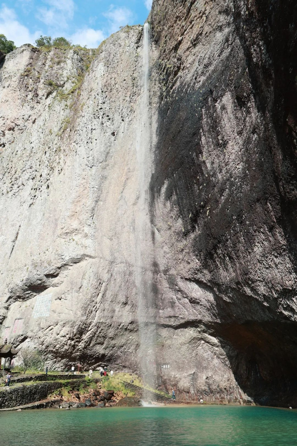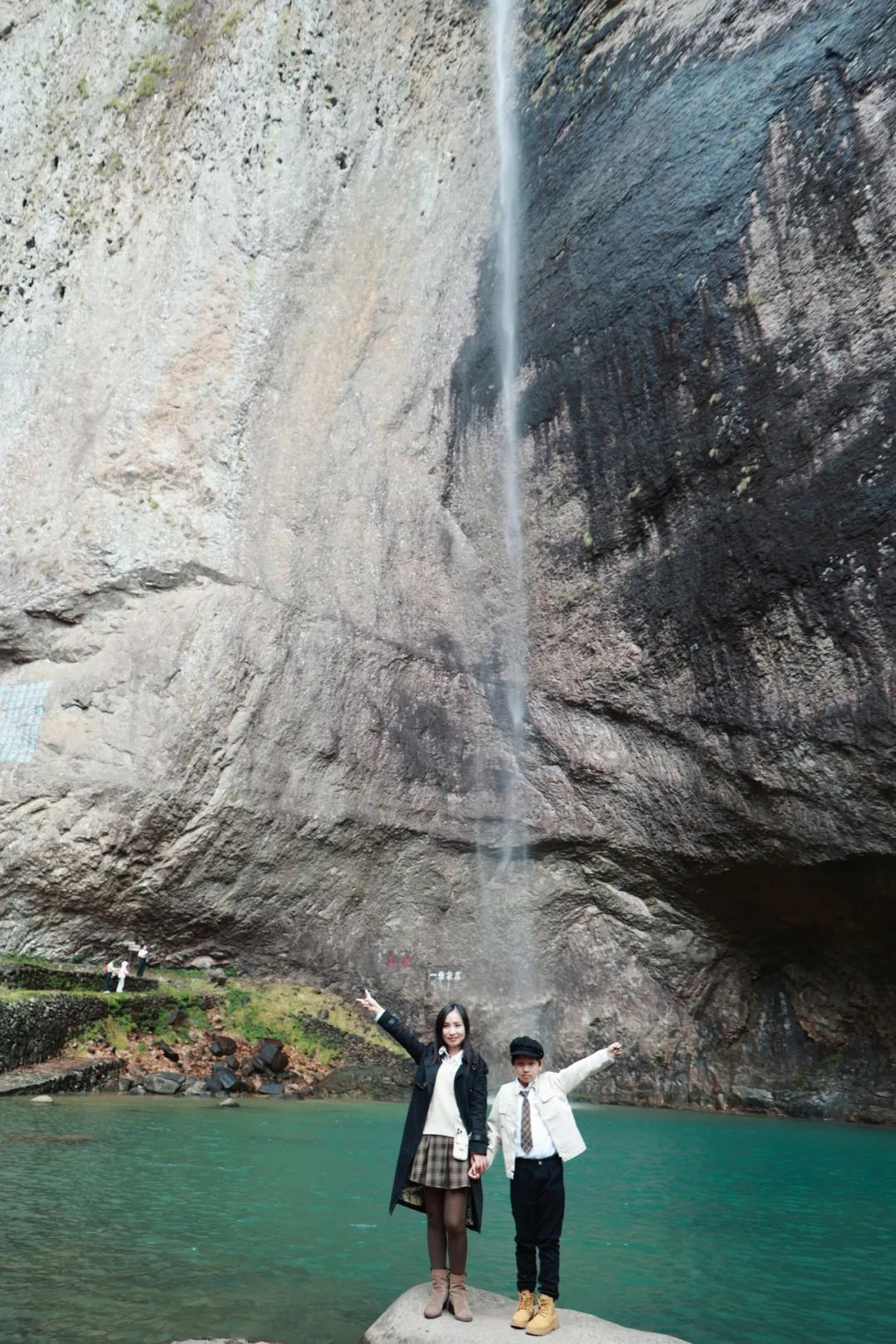 一到大龙湫,只见瀑布从近200米的悬崖上飞泻而下,眼下正值秋冬,水量少,据说丰水期的时候飞瀑直下,气势磅礴。