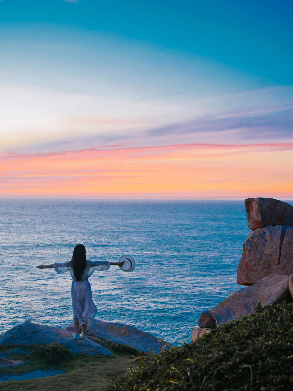 而来三盘尾,看日出是最不能错过的打卡方式坐着景交车来到天然草坪观景台观赏悬崖日出,看着那抹小小的咸蛋黄慢慢从海平面升起,一点点的突破云层直至霞光洒满大海和天际,礁石群也跟着慢慢变成粉紫色,凌晨四点起床的困意瞬间全无,也太治愈了吧!