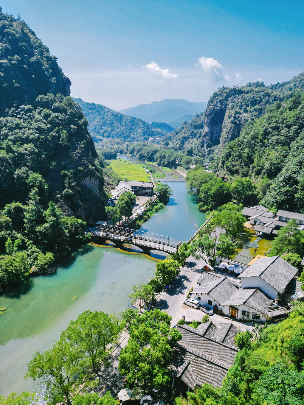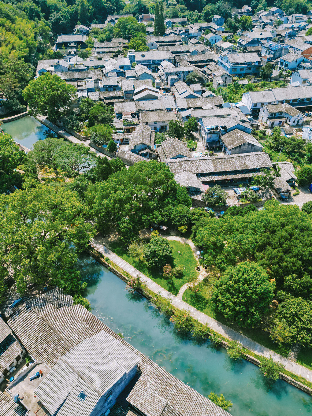 绿树掩映之下,果盒桥沧桑的桥身横跨在河的两岸,远处是鳞次栉比的险峻山峦,近处是流水潺潺的小瀑,满是江南山水的诗情画意~